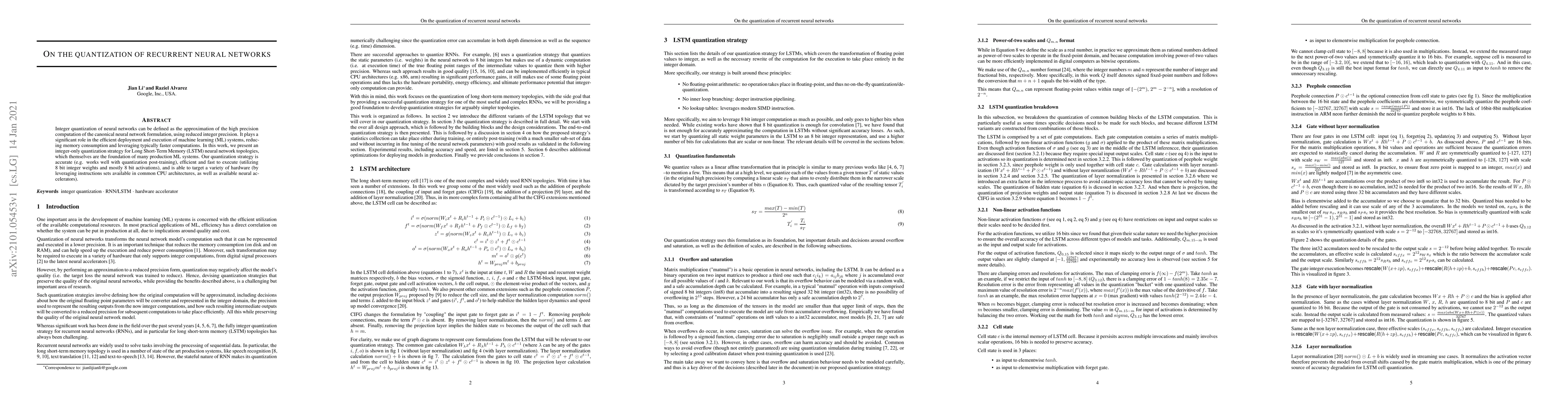 This paper proposes an integer-only quantization strategy for Long Short-Term Memory (LSTM) neural networks, aiming to reduce memory consumption and improve computational efficiency while maintaining accuracy, especially suitable for deployment on various hardware platforms. The strategy utilizes 8-bit integer weights and activations, ensuring fast execution and compatibility with common CPU architectures and neural accelerators.