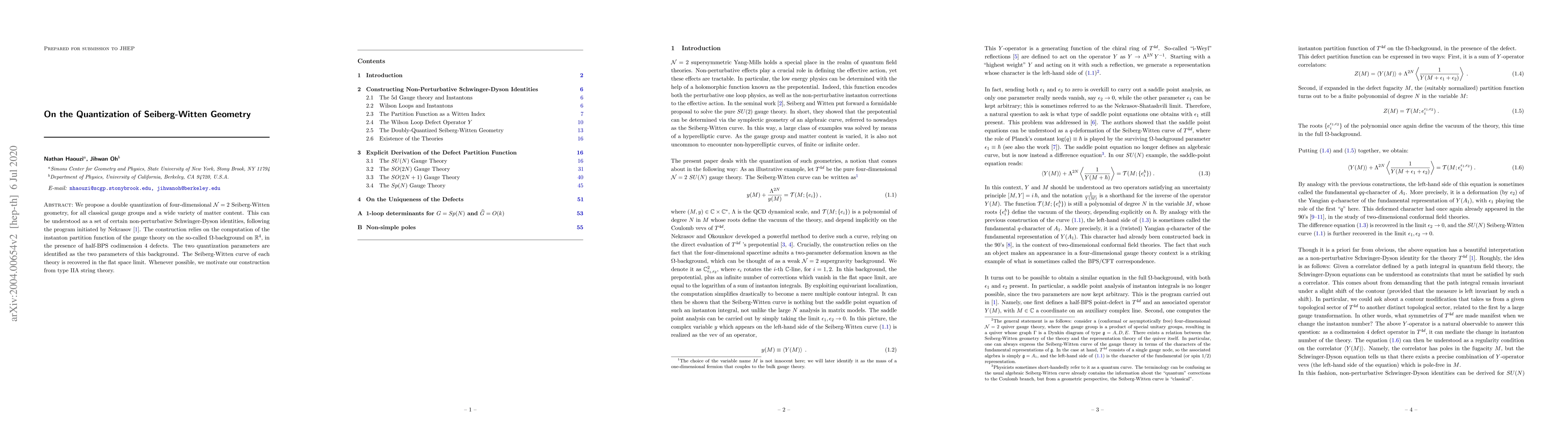 This paper proposes a double quantization of four-dimensional $\mathcal{N}=2$ Seiberg-Witten geometry, utilizing non-perturbative Schwinger-Dyson identities and instanton partition functions on $\Omega$-backgrounds. The construction is motivated by type IIA string theory, with the Seiberg-Witten curve recovered in the flat space limit.