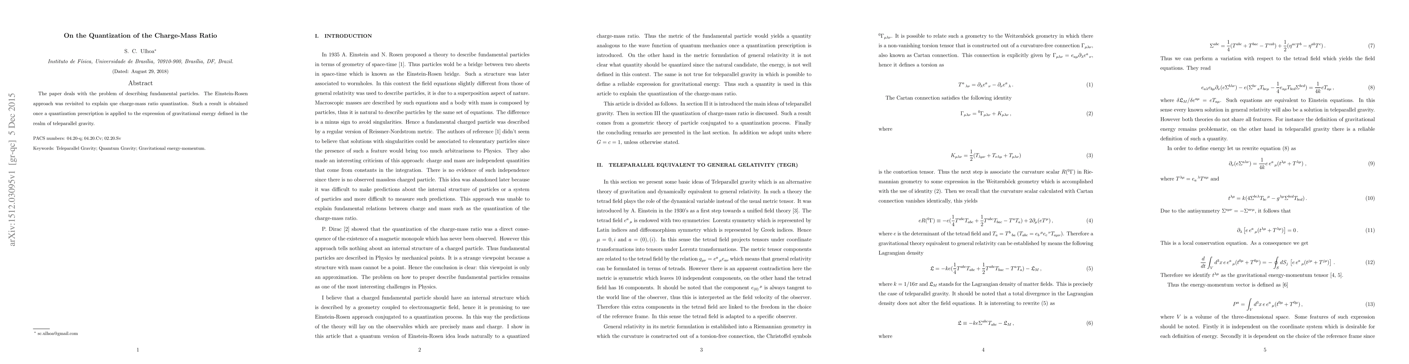 The paper deals with the problem of describing fundamental particles. The Einstein-Rosen approach was revisited to explain que charge-mass ratio quantization. Such a result is obtained once a quantization prescription is applied to the expression of gravitational energy defined in the realm of teleparallel gravity.