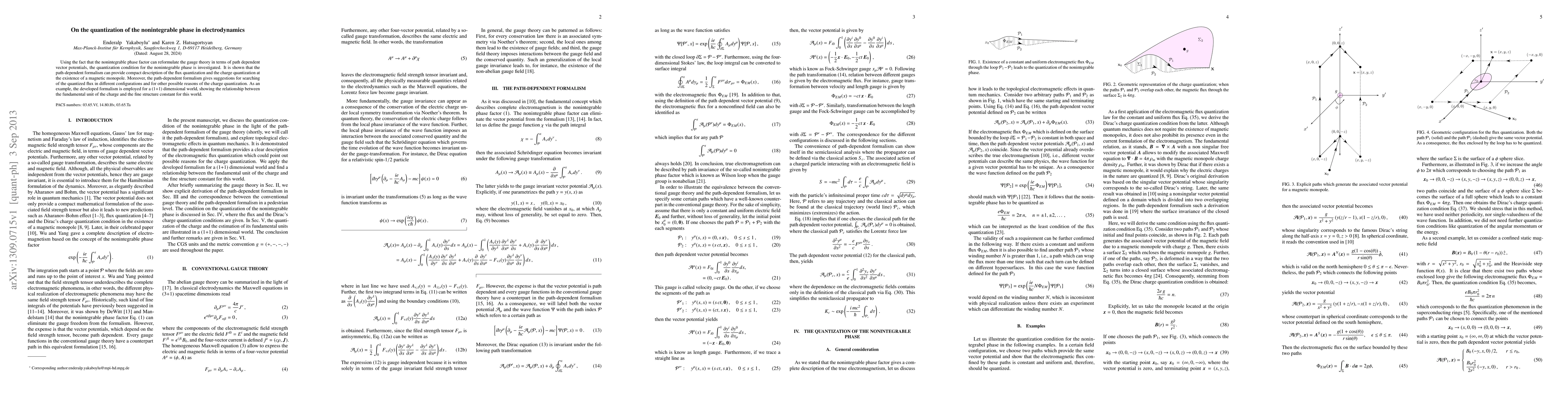 This paper investigates the quantization condition for the nonintegrable phase in electrodynamics, demonstrating that a path-dependent formalism can compactly describe flux and charge quantization, especially in the presence of a magnetic monopole. It also suggests methods for detecting quantized flux and explores the relationship between charge quantization and the fine structure constant in a (1+1) dimensional world.