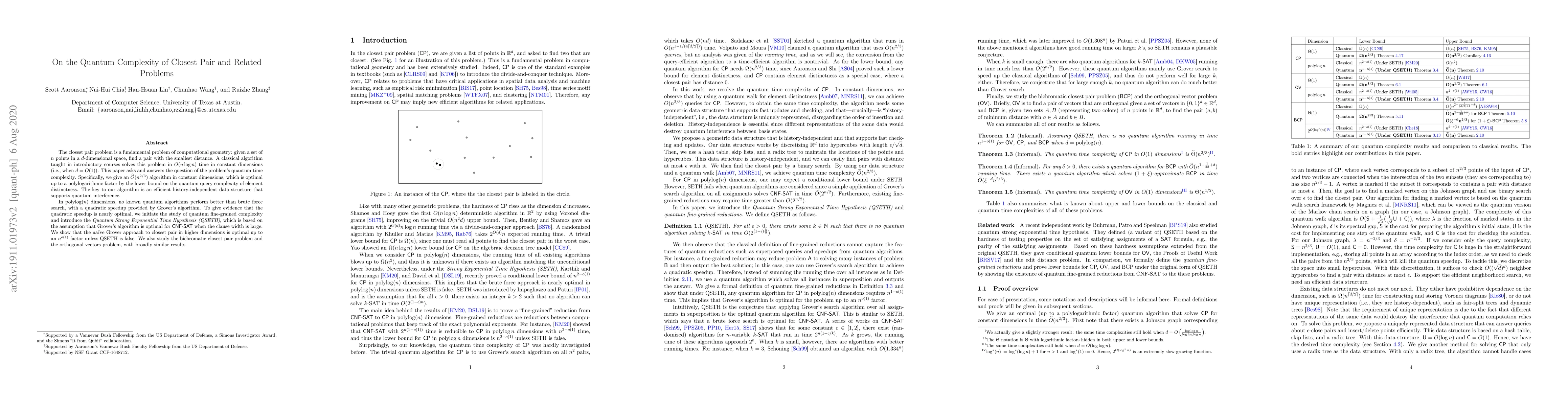 This paper investigates the quantum complexity of the closest pair problem in computational geometry, presenting a $\tilde{O}(n^{2/3})$ quantum algorithm for constant dimensions. It also introduces the Quantum Strong Exponential Time Hypothesis (QSETH) to argue that the quadratic speedup from Grover's algorithm is nearly optimal for higher dimensions.