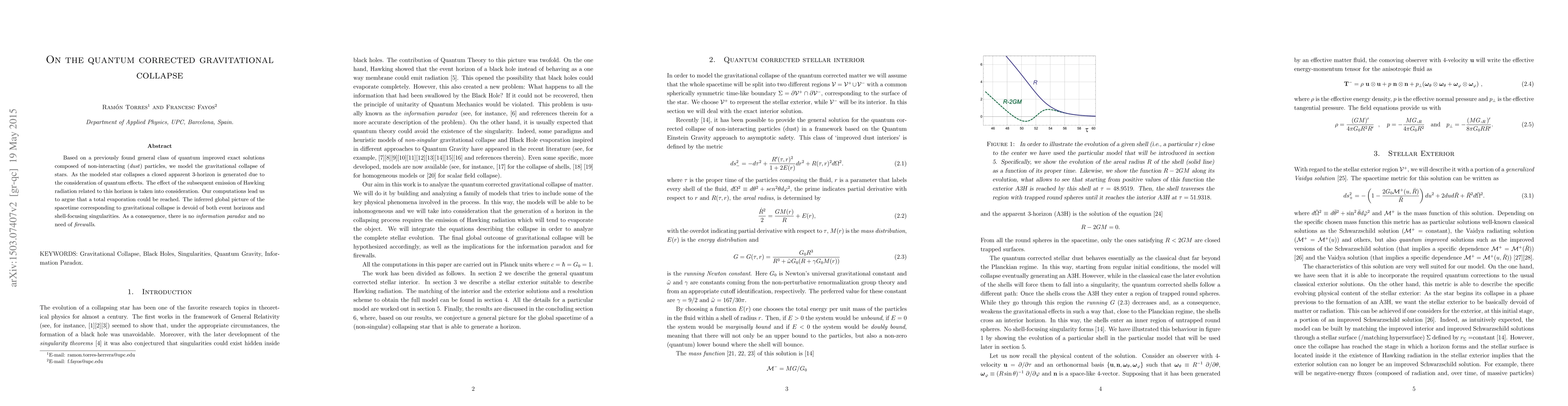 Based on a previously found general class of quantum improved exact solutions composed of non-interacting (dust) particles, we model the gravitational collapse of stars. As the modeled star collapses a closed apparent 3-horizon is generated due to the consideration of quantum effects. The effect of the subsequent emission of Hawking radiation related to this horizon is taken into consideration. Our computations lead us to argue that a total evaporation could be reached. The inferred global picture of the spacetime corresponding to gravitational collapse is devoid of both event horizons and shell-focusing singularities. As a consequence, there is no information paradox and no need of firewalls.