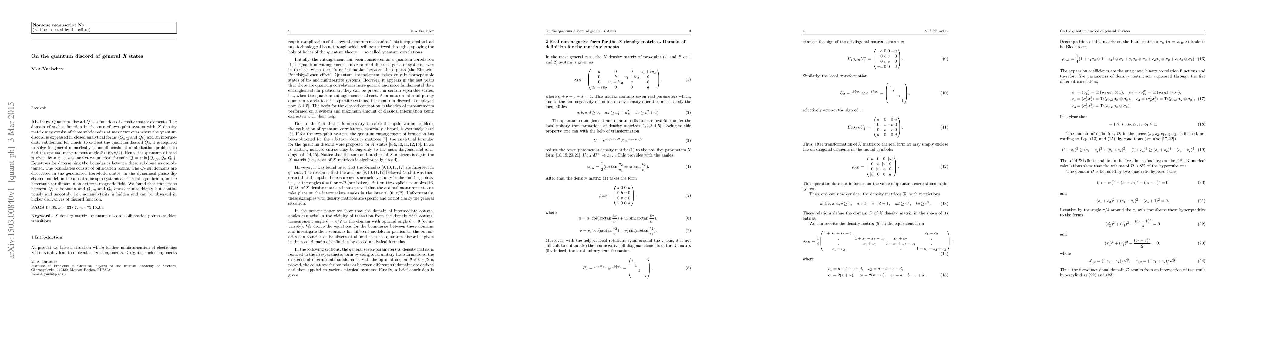 Quantum discord Q is a function of density matrix elements. The domain of such a function in the case of two-qubit system with X density matrix may consist of three subdomains at most: two ones where the quantum discord is expressed in closed analytical forms (Q_{\pi/2} and Q_0) and an intermediate subdomain for which, to extract the quantum discord Q_\theta, it is required to solve in general numerically a one-dimensional minimization problem to find the optimal measurement angle \theta\in(0,\pi/2). Hence the quantum discord is given by a piecewise-analytic-numerical formula Q=\min{Q_{\pi/2}, Q_\theta, Q_0}. Equations for determining the boundaries between these subdomains are obtained. The boundaries consist of bifurcation points. The Q_{\theta} subdomains are discovered in the generalized Horodecki states, in the dynamical phase flip channel model, in the anisotropic spin systems at thermal equilibrium, in the heteronuclear dimers in an external magnetic field. We found that transitions between Q_{\theta} subdomain and Q_{\pi/2} and Q_0 ones occur suddenly but continuously and smoothly, i.e., nonanalyticity is hidden and can be observed in higher derivatives of discord function.