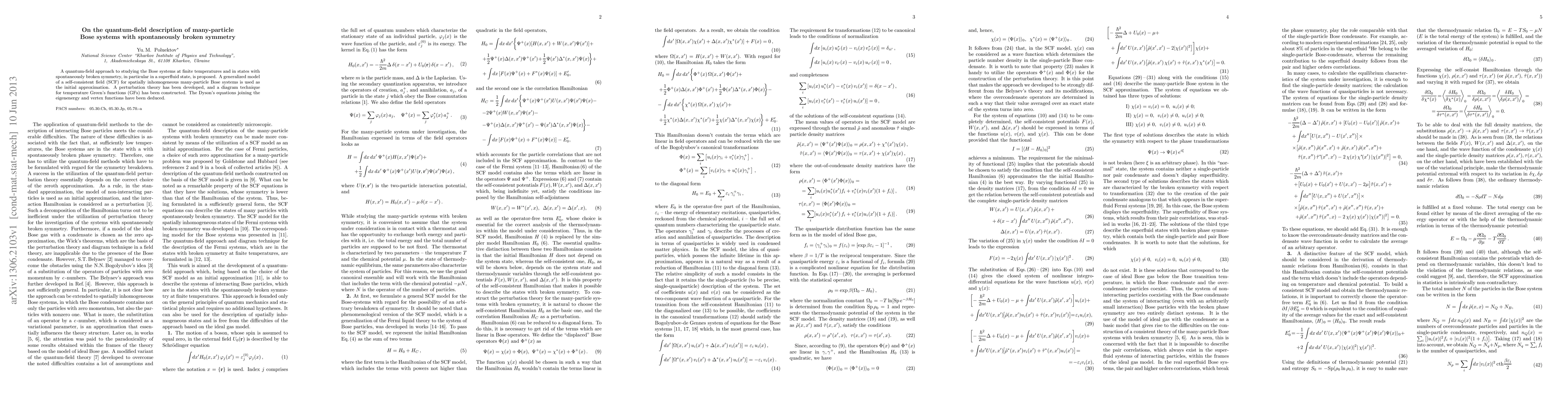 This paper proposes a quantum-field approach to study Bose systems at finite temperatures with spontaneously broken symmetry, particularly in superfluid states. It utilizes a generalized self-consistent field model and develops a perturbation theory with a diagram technique for temperature Green's functions and Dyson's equations for eigenenergy and vertex functions.