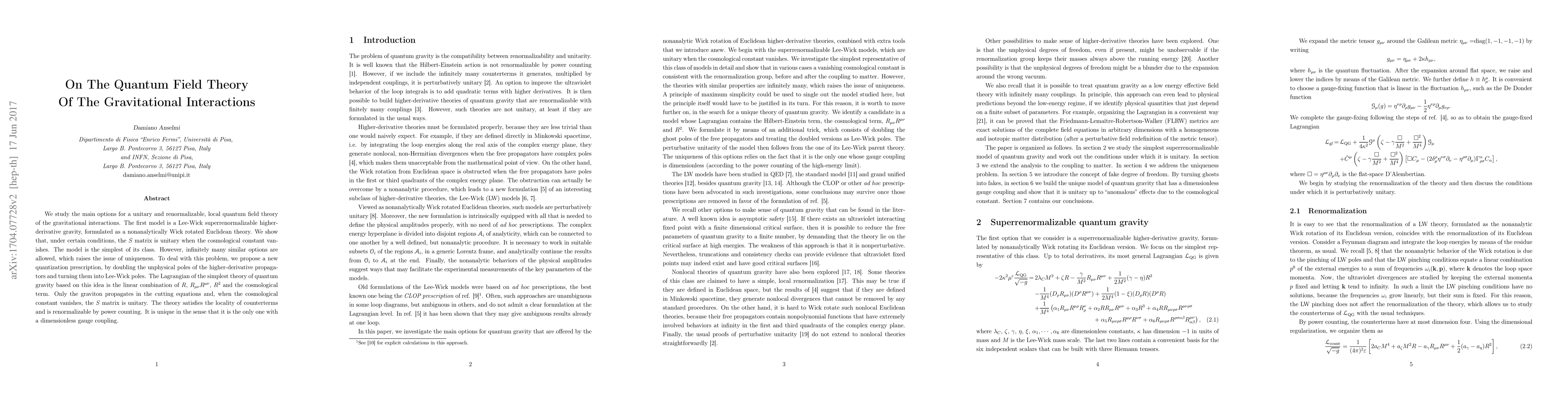 We study the main options for a unitary and renormalizable, local quantum field theory of the gravitational interactions. The first model is a Lee-Wick superrenormalizable higher-derivative gravity, formulated as a nonanalytically Wick rotated Euclidean theory. We show that, under certain conditions, the $S$ matrix is unitary when the cosmological constant vanishes. The model is the simplest of its class. However, infinitely many similar options are allowed, which raises the issue of uniqueness. To deal with this problem, we propose a new quantization prescription, by doubling the unphysical poles of the higher-derivative propagators and turning them into Lee-Wick poles. The Lagrangian of the simplest theory of quantum gravity based on this idea is the linear combination of $R$, $R_{\mu \nu }R^{\mu \nu }$, $R^{2}$ and the cosmological term. Only the graviton propagates in the cutting equations and, when the cosmological constant vanishes, the $S$ matrix is unitary. The theory satisfies the locality of counterterms and is renormalizable by power counting. It is unique in the sense that it is the only one with a dimensionless gauge coupling.