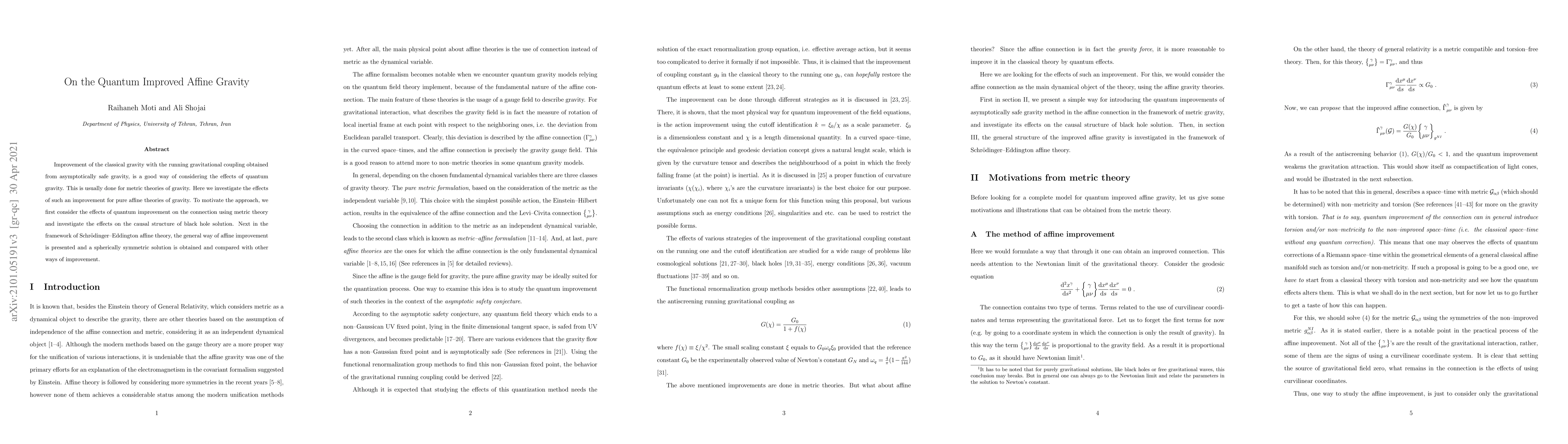 Improvement of the classical gravity with the running gravitational coupling obtained from asymptotically safe gravity, is a good way of considering the effects of quantum gravity. This is usually done for metric theories of gravity. Here we investigate the effects of such an improvement for pure affine theories of gravity. To motivate the approach, we first consider the effects of quantum improvement on the connection using metric theory and investigate the effects on the causal structure of black hole solution. Next in the framework of Schr\"odinger-Eddington affine theory, the general way of affine improvement is presented and a spherically symmetric solution is obtained and compared with other ways of improvement.