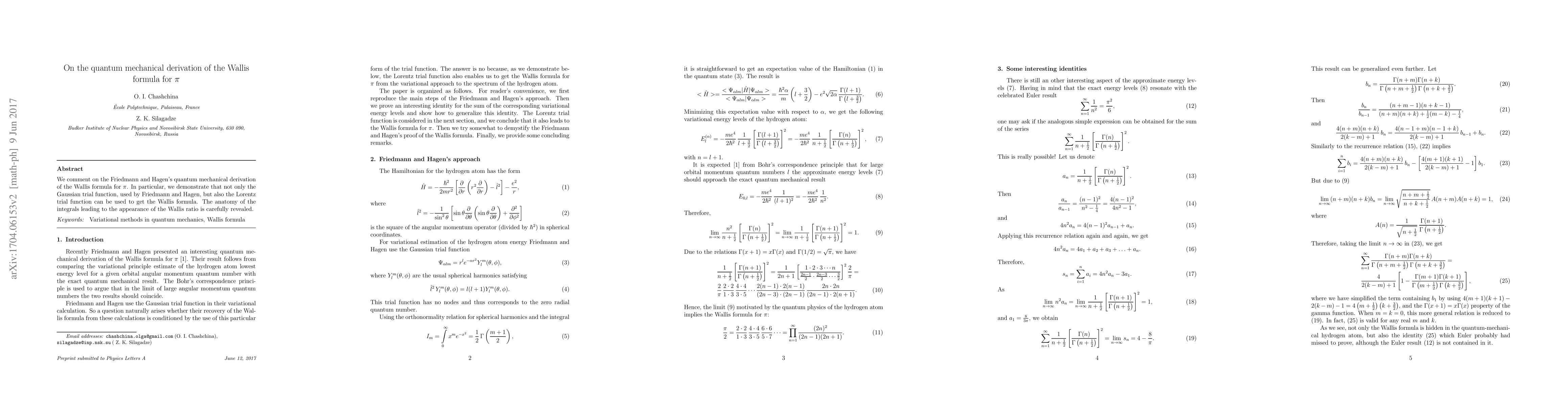 This paper explores alternative quantum mechanical derivations of the Wallis formula for $\pi$, showing that both Gaussian and Lorentz trial functions can yield the formula, and provides a detailed analysis of the integrals involved.