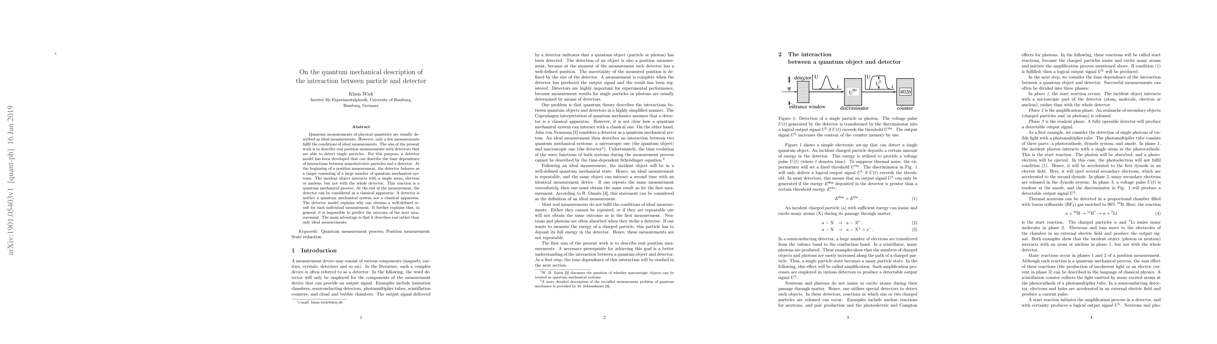 Quantum measurements of physical quantities are usually described as ideal measurements. However, only a few measurements fulfil the conditions of ideal measurements. The aim of the present work is to describe real position measurements with detectors that are able to detect single particles. For this purpose, a detector model has been developed that can describe the time dependence of interactions between nonrelativistic particles and a detector. At the beginning of a position measurement, the detector behaves as a target consisting of a large number of quantum mechanical systems. The incident object interacts with a single atom, electron or nucleus, but not with the whole detector. This reaction is a quantum mechanical process. At the end of the measurement, the detector can be considered as a classical apparatus. A detector is neither a quantum mechanical system nor a classical apparatus. The detector model explains why one obtains a well-defined result for each individual measurement. It further explains that, in general, it is impossible to predict the outcome of the next measurement. The main advantage is that it describes real rather than only ideal measurements.