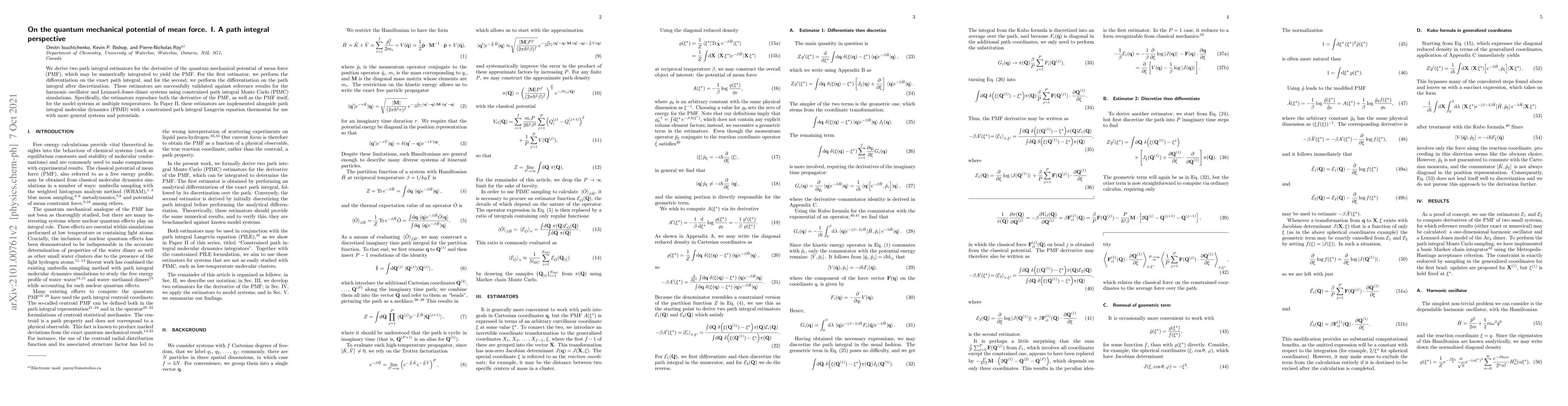 We derive two path integral estimators for the derivative of the quantum mechanical potential of mean force (PMF), which may be numerically integrated to yield the PMF. For the first estimator, we perform the differentiation on the exact path integral, and for the second, we perform the differentiation on the path integral after discretization. These estimators are successfully validated against reference results for the harmonic oscillator and Lennard-Jones dimer systems using constrained path integral Monte Carlo (PIMC) simulations. Specifically, the estimators reproduce both the derivative of the PMF, as well as the PMF itself, for the model systems at multiple temperatures. In Paper II, these estimators are implemented alongside path integral molecular dynamics (PIMD) with a constrained path integral Langevin equation thermostat for use with more general systems and potentials.