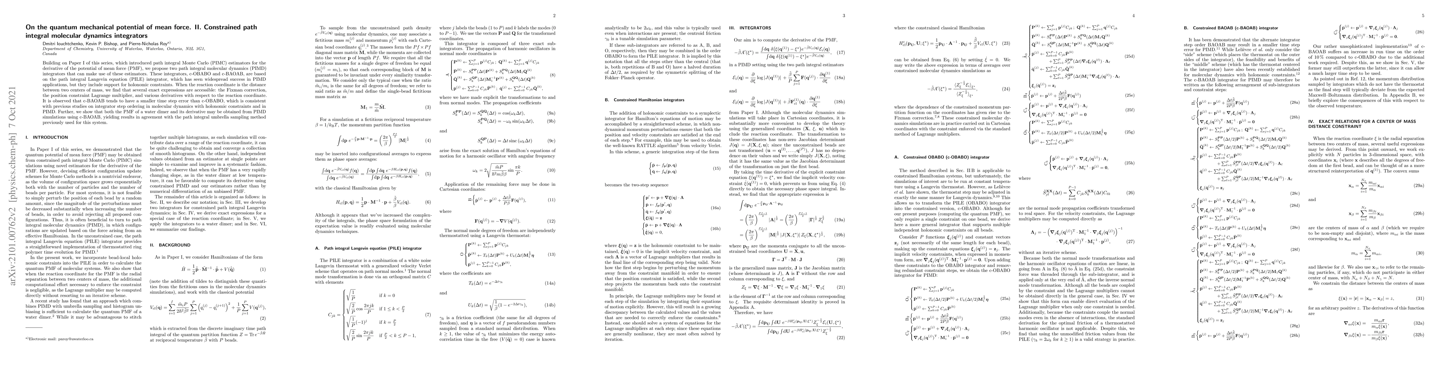 Building on Paper I of this series, which introduced path integral Monte Carlo (PIMC) estimators for the derivative of the potential of mean force (PMF), we propose two path integral molecular dynamics (PIMD) integrators that can make use of these estimators. These integrators, c-OBABO and c-BAOAB, are based on the path integral Langevin equation (PILE) integrator, which has seen widespread success in PIMD applications, but they include support for holonomic constraints. When the reaction coordinate is the distance between two centers of mass, we find that several exact expressions are accessible: the Fixman correction, the position constraint Lagrange multiplier, and various derivatives with respect to the reaction coordinate. It is observed that c-BAOAB tends to have a smaller time step error than c-OBABO, which is consistent with previous studies on integrator step ordering in molecular dynamics with holonomic constraints and in PIMD. Further, we show that both the PMF of a water dimer and its derivative may be obtained from PIMD simulations using c-BAOAB, yielding results in agreement with the path integral umbrella sampling method previously used for this system.