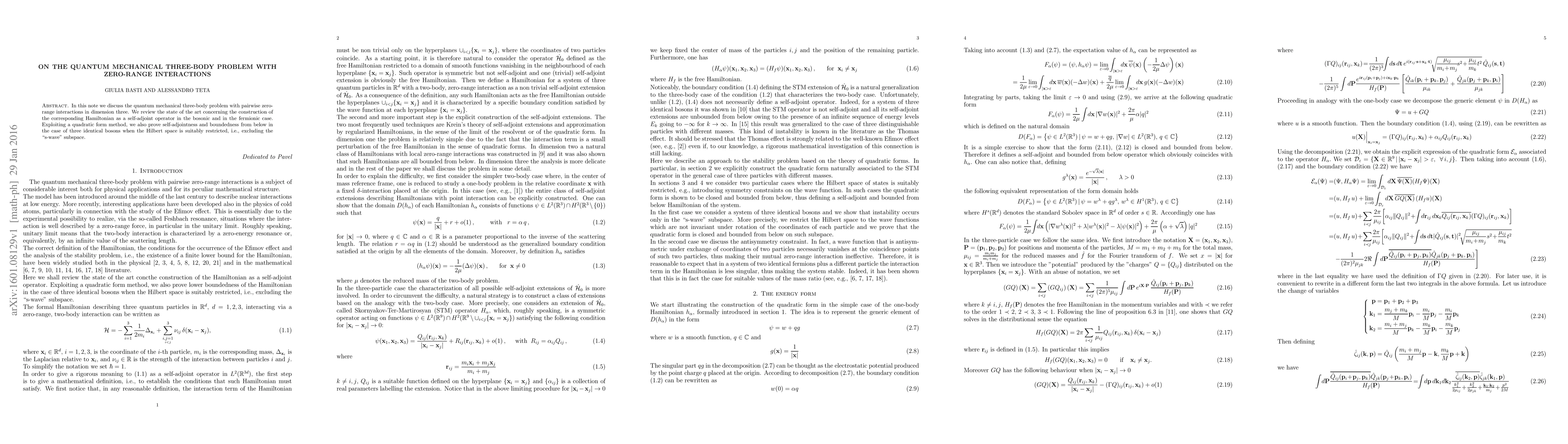 This paper reviews the construction of the Hamiltonian for the quantum mechanical three-body problem with zero-range interactions, focusing on bosonic and fermionic cases. It proves self-adjointness and boundedness for three identical bosons by excluding the "s-wave" subspace using a quadratic form method.