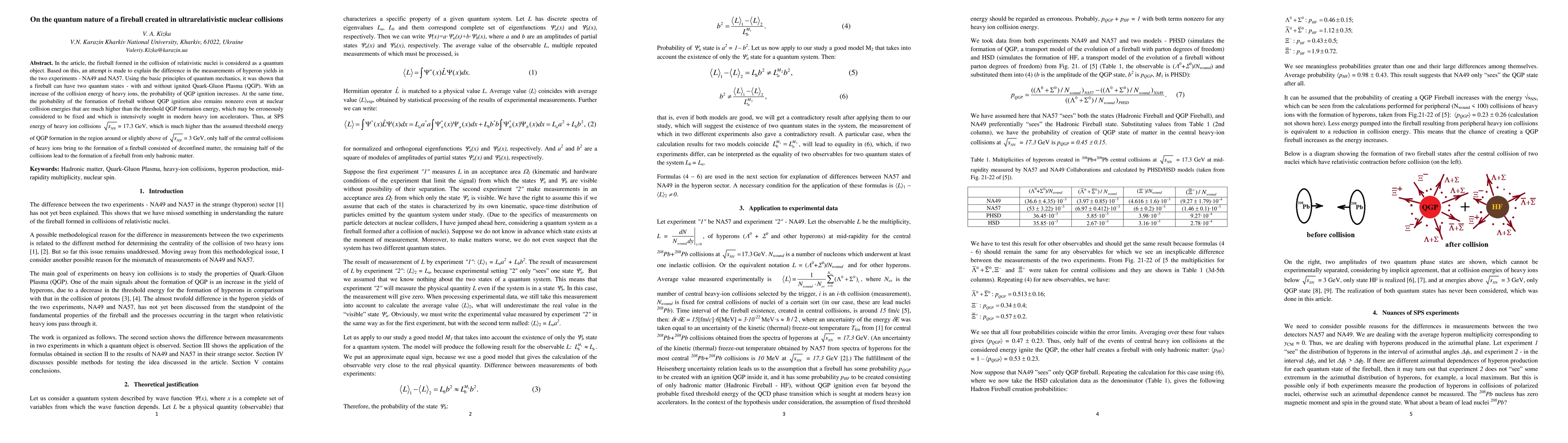 This paper explores the quantum nature of a fireball in ultrarelativistic nuclear collisions, demonstrating that it can exist in two quantum states: one with an ignited Quark-Gluon Plasma (QGP) and one without. It explains the differing hyperon yields in the NA49 and NA57 experiments, showing that even at high collision energies, not all fireballs ignite QGP, contrary to common assumptions.