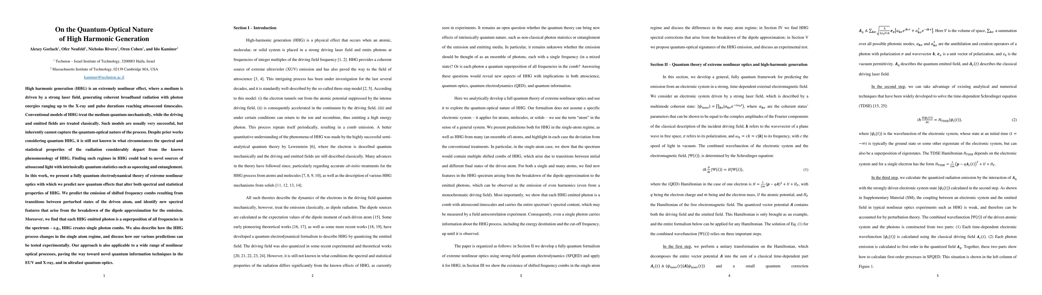 This paper develops a fully quantum electrodynamical theory to explore the quantum-optical nature of high harmonic generation, predicting new quantum effects such as shifted frequency combs and single photon combs. The study also discusses how the HHG process alters in the single atom regime and proposes experimental tests for these novel quantum phenomena.