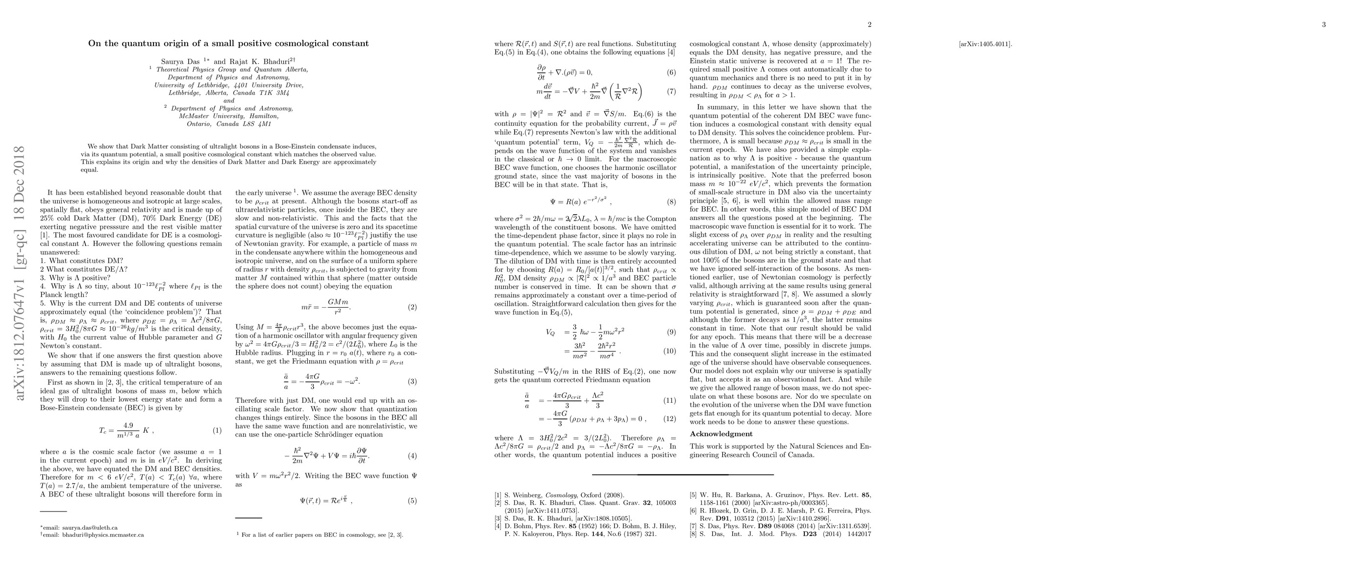 This paper proposes that ultralight bosons forming Dark Matter in a Bose-Einstein condensate create a quantum potential that results in a small positive cosmological constant, aligning with observed values and elucidating the similarity in densities between Dark Matter and Dark Energy.