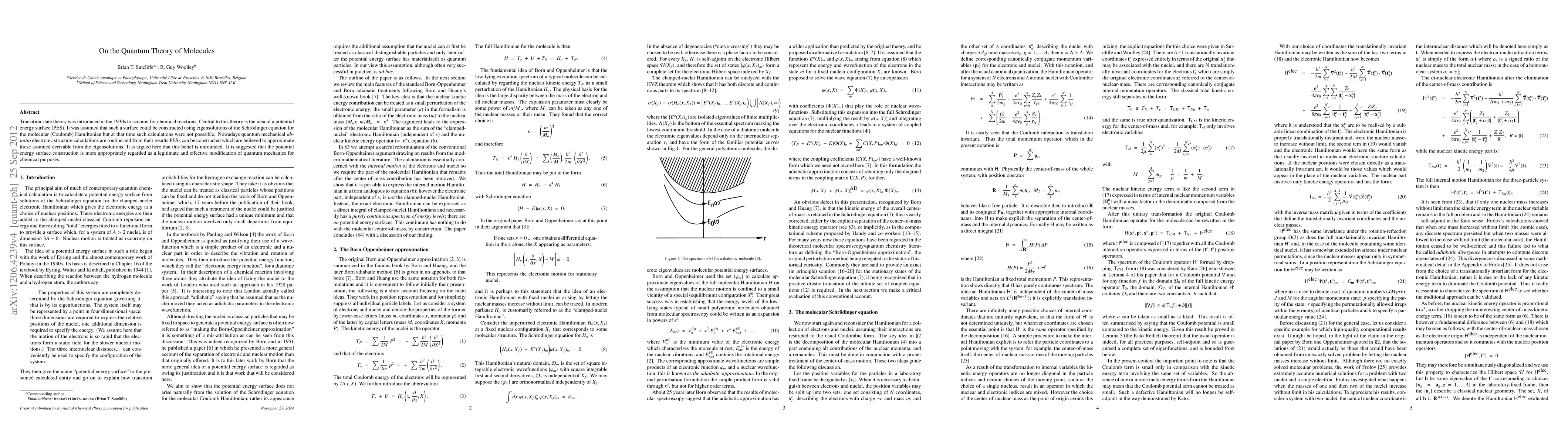 Transition state theory was introduced in the 1930s to account for chemical reactions. Central to this theory is the idea of a potential energy surface (PES). It was assumed that such a surface could be constructed using eigensolutions of the Schr\"{o}dinger equation for the molecular (Coulomb) Hamiltonian but at that time such calculations were not possible. Nowadays quantum mechanical ab-initio electronic structure calculations are routine and from their results PESs can be constructed which are believed to approximate those assumed derivable from the eigensolutions. It is argued here that this belief is unfounded. It is suggested that the potential energy surface construction is more appropriately regarded as a legitimate and effective modification of quantum mechanics for chemical purposes
