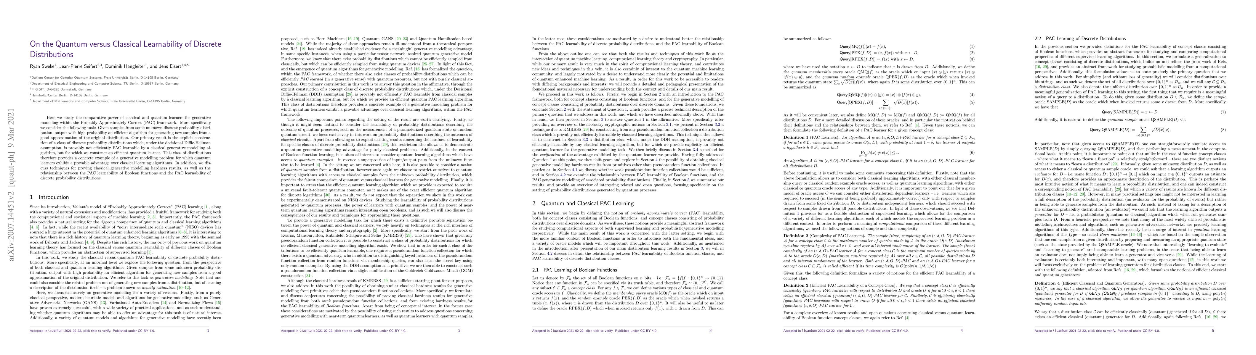 This paper investigates the comparative efficiency of classical versus quantum learning algorithms for generative modelling of discrete distributions under the PAC framework. It demonstrates a class of distributions that classical learners cannot efficiently learn, while quantum learners can, providing a concrete example of quantum learning's advantage.