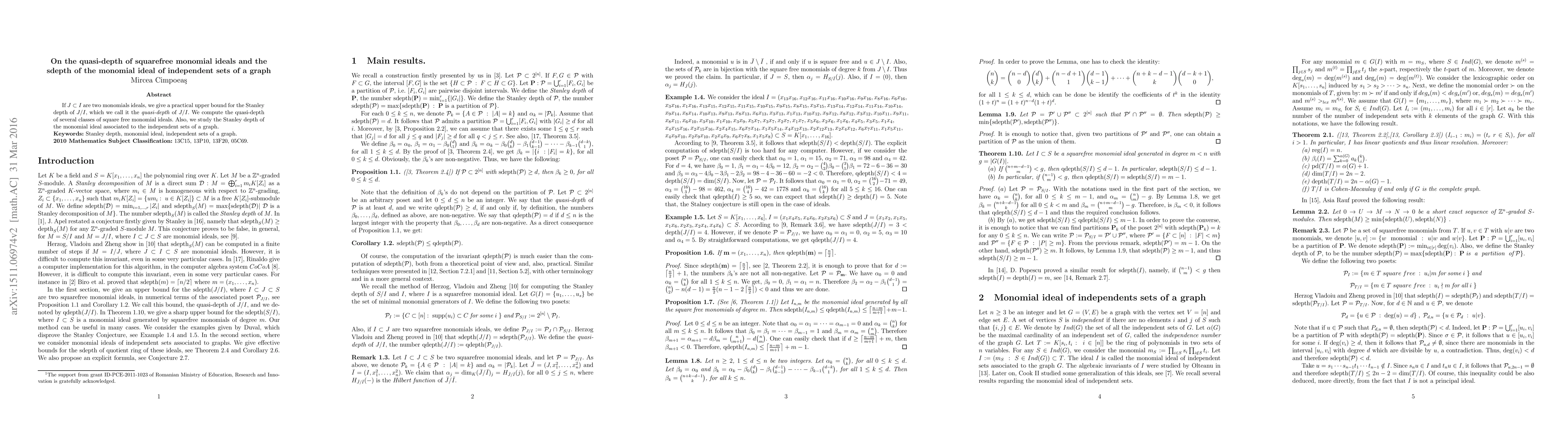 This paper provides an upper bound for the quasi-depth of the quotient of two monomial ideals and computes this quasi-depth for specific classes of squarefree monomial ideals. It also investigates the Stanley depth of the monomial ideal derived from the independent sets of a graph.