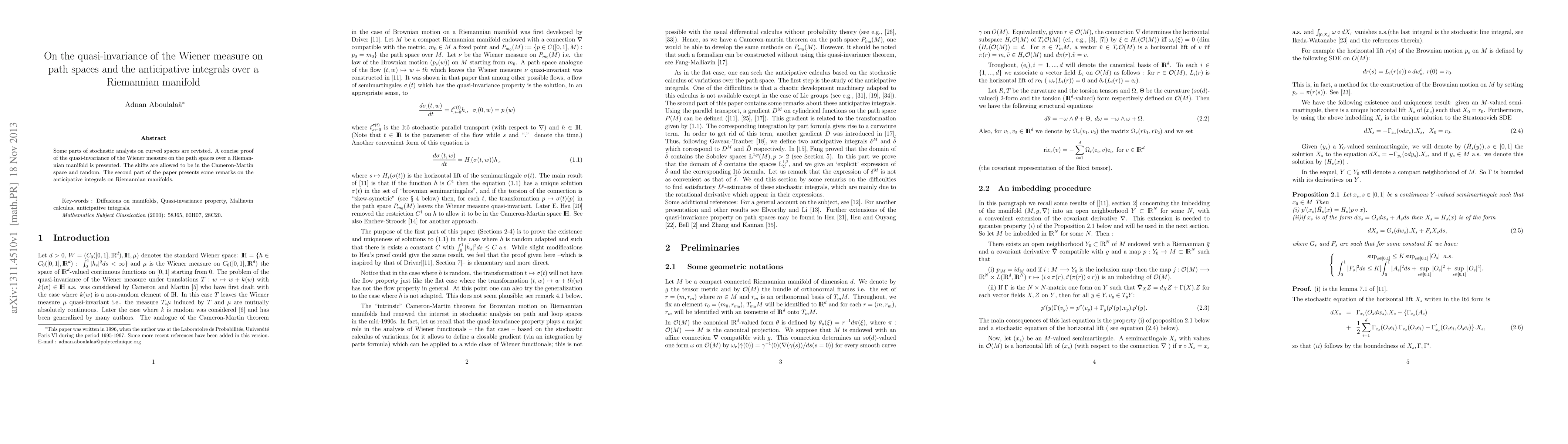 Some parts of stochastic analysis on curved spaces are revisted. A concise proof of the quasi-invariance of the Wiener measure on the path spaces over a Riemannian manifold is presented. The shifts are allowed to be in the Cameron-Martin space and random. The second part of the paper presents some remarks on the anticipative integrals on Riemannian manifolds.