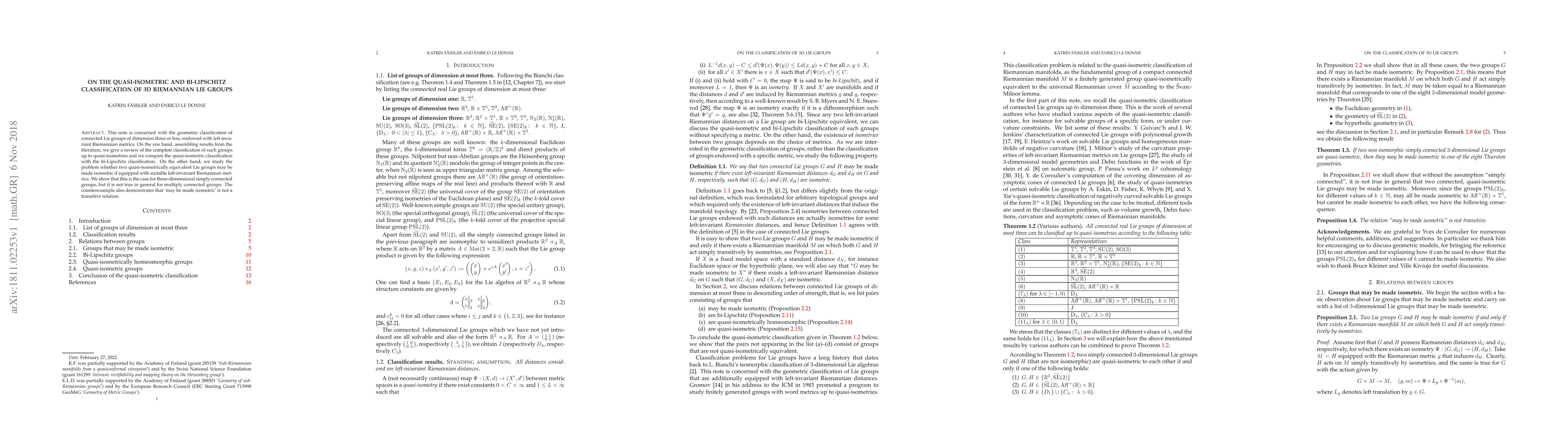 This note is concerned with the geometric classification of connected Lie groups of dimension three or less, endowed with left-invariant Riemannian metrics. On the one hand, assembling results from the literature, we give a review of the complete classification of such groups up to quasi-isometries and we compare the quasi-isometric classification with the bi-Lipschitz classification. On the other hand, we study the problem whether two quasi-isometrically equivalent Lie groups may be made isometric if equipped with suitable left-invariant Riemannian metrics. We show that this is the case for three-dimensional simply connected groups, but it is not true in general for multiply connected groups. The counterexample also demonstrates that `may be made isometric' is not a transitive relation.