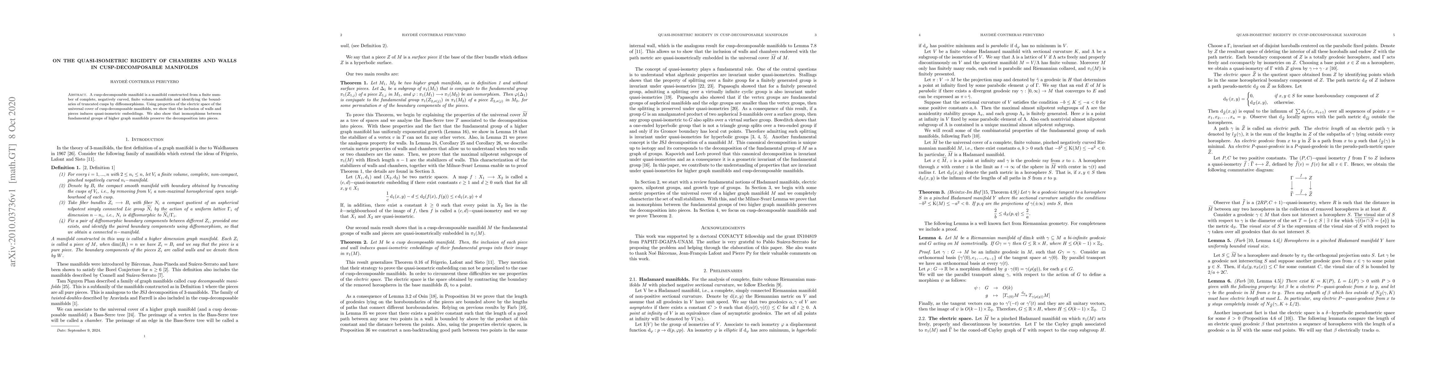 Summary: The paper demonstrates quasi-isometric rigidity in cusp-decomposable manifolds by proving that wall inclusions and pieces are quasi-isometric embeddings, and that isomorphisms between fundamental groups preserve the decomposition structure.