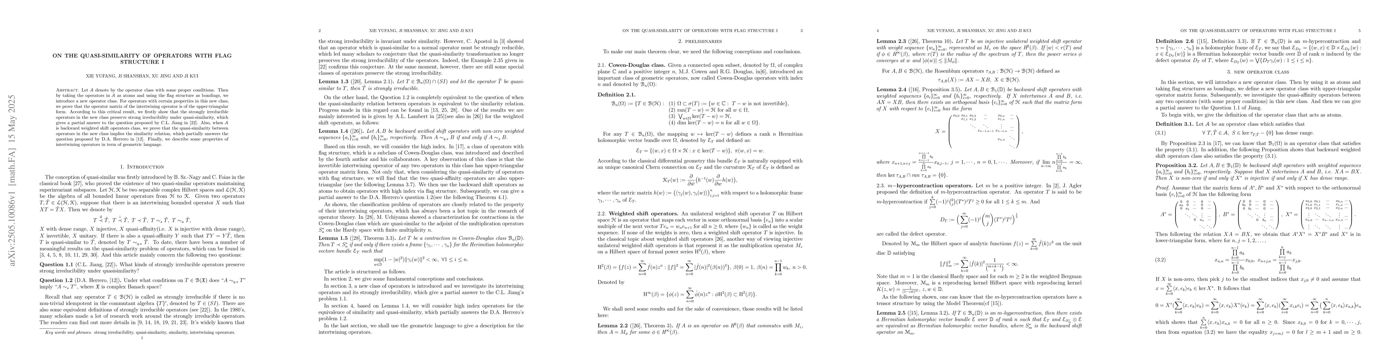 The paper presents a novel operator class based on flag structure and proves critical results regarding the upper-triangular form of intertwining operator matrices under quasi-similarity.