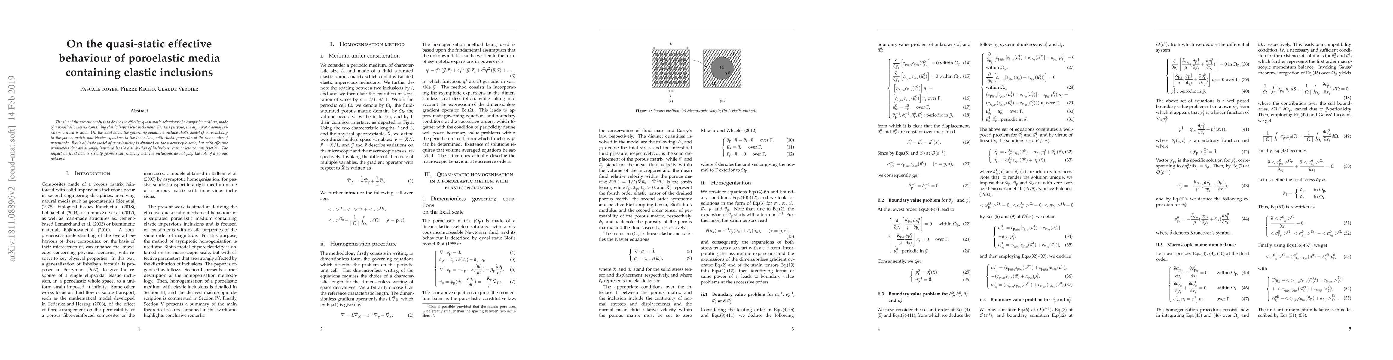 This study derives the effective quasi-static behaviour of poroelastic media with elastic inclusions using asymptotic homogenisation. It finds that the distribution of inclusions significantly impacts the effective parameters of Biot's diphasic model, despite their low volume fraction, without acting as a porous network.