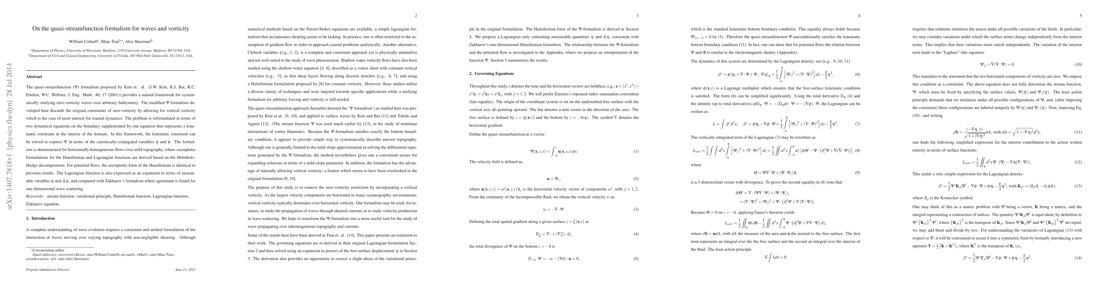This paper introduces a modified quasi-streamfunction (Psi) formalism, extending Kim et al.'s work to include vertical vorticity, crucial for coastal dynamics. It reformulates wave-vorticity problems using boundary equations and an interior kinematic constraint, expressing Psi via conjugate variables. The method is demonstrated for horizontally homogeneous flows over mild topography, deriving asymptotic forms of Hamiltonian and Lagrangian functions using Helmholtz-Hodge decomposition. For potential flows, the Hamiltonian matches prior results, and the Lagrangian is expressed as an expansion in surface height and its derivative, agreeing with Zakharov's formalism for one-dimensional wave scattering.