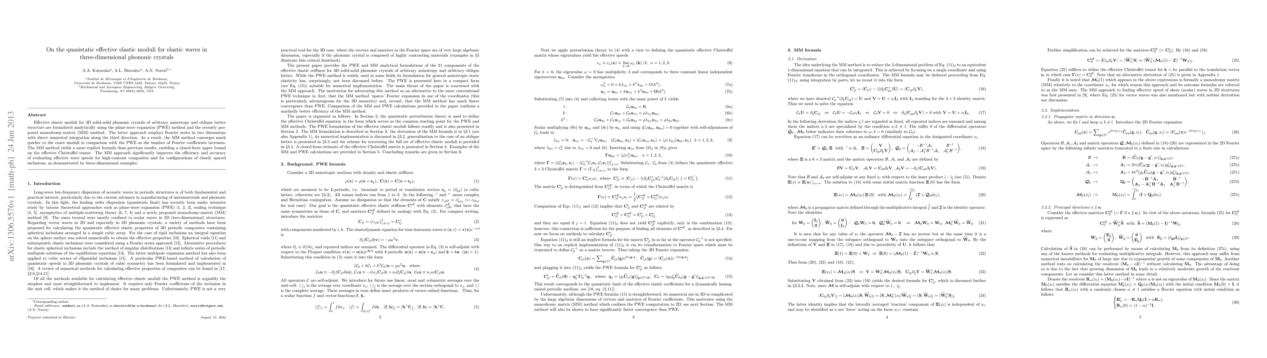 Effective elastic moduli for 3D solid-solid phononic crystals of arbitrary anisotropy and oblique lattice structure are formulated analytically using the plane-wave expansion (PWE) method and the recently proposed monodromy-matrix (MM) method. The latter approach employs Fourier series in two dimensions with direct numerical integration along the third direction. As a result, the MM method converges much quicker to the exact moduli in comparison with the PWE as the number of Fourier coefficients increases. The MM method yields a more explicit formula than previous results, enabling a closed-form upper bound on the effective Christoffel tensor. The MM approach significantly improves the efficiency and accuracy of evaluating effective wave speeds for high-contrast composites and for configurations of closely spaced inclusions, as demonstrated by three-dimensional examples.