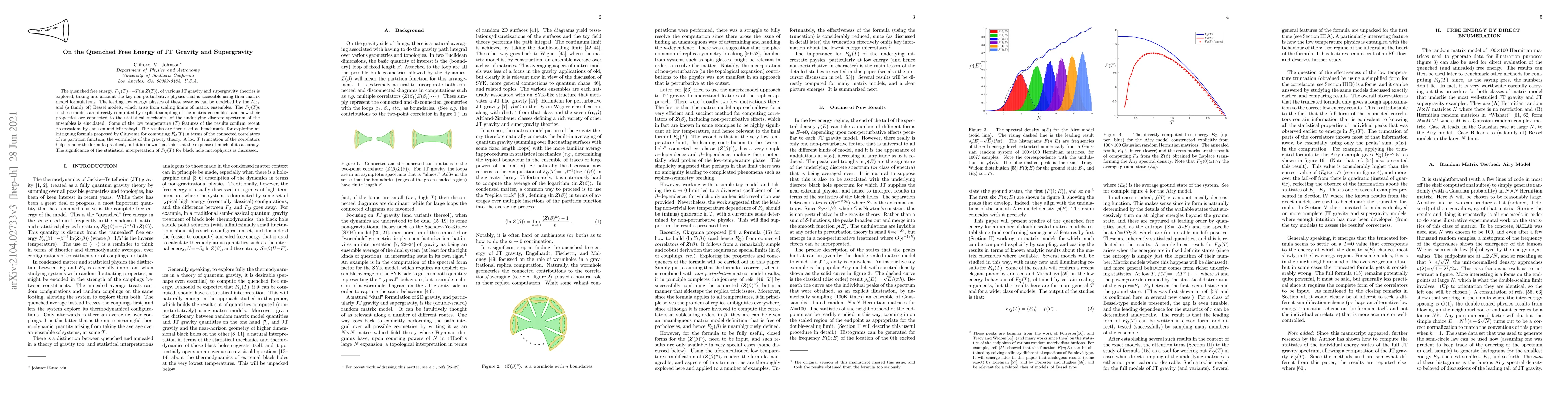 The quenched free energy, $F_Q(T){=}{-}T\langle \ln Z(T)\rangle$, of various JT gravity and supergravity theories is explored, taking into account the key non-perturbative physics that is accessible using their matrix model formulations. The leading low energy physics of these systems can be modelled by the Airy and (a family of) Bessel models, which arise from scaling limits of matrix ensembles. The $F_Q(T)$s of these models are directly computed by explicit sampling of the matrix ensembles, and how their properties are connected to the statistical mechanics of the underlying discrete spectrum of the ensembles is elucidated. Some of the low temperature ($T$) features of the results confirm recent observations by Jassen and Mirbabayi. The results are then used as benchmarks for exploring an intriguing formula proposed by Okuyama for computing $F_Q(T)$ in terms of the connected correlators of its partition function, the wormholes of the gravity theory. A low $T$ truncation of the correlators helps render the formula practical, but it is shown that this is at the expense of much of its accuracy. The significance of the statistical interpretation of $F_Q(T)$ for black hole microphysics is discussed.