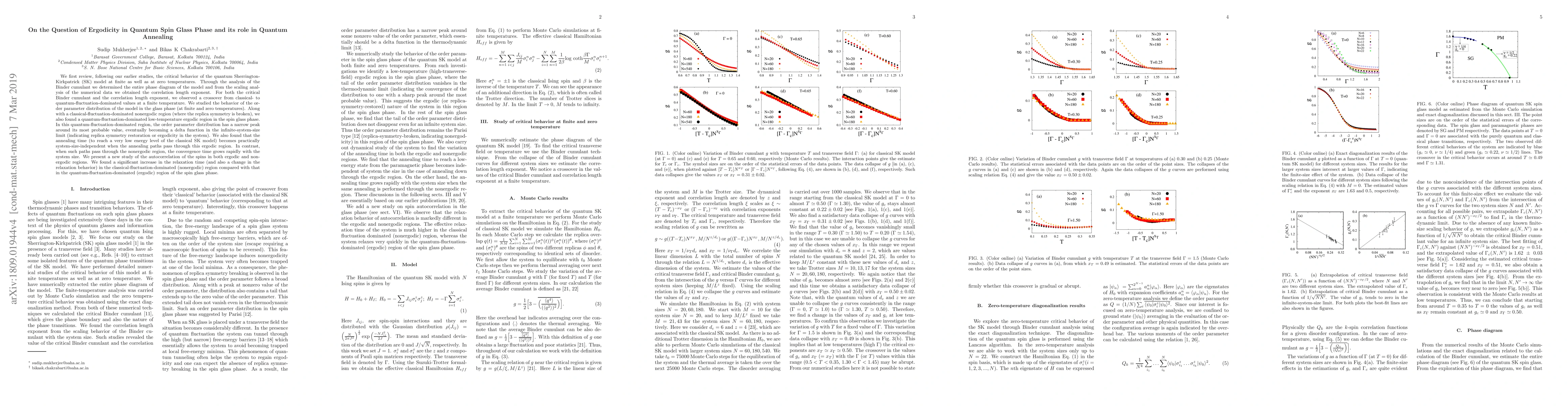 We first review, following our earlier studies, the critical behavior of the quantum Sherrington-Kirkpatrick (SK) model at finite as well as at zero temperatures. Through the analysis of the Binder cumulant we determined the entire phase diagram of the model and from the scaling analysis of the numerical data we obtained the correlation length exponent. For both the critical Binder cumulant and the correlation length exponent, we observed a crossover from classical- to quantum-fluctuation-dominated values at a finite temperature. We studied the behavior of the order parameter distribution of the model in the glass phase (at finite and zero temperatures). Along with a classical-fluctuation-dominated nonergodic region (where the replica symmetry is broken), we also found a quantum-fluctuation-dominated low-temperature ergodic region in the spin glass phase. In this quantum-fluctuation-dominated region, the order parameter distribution has a narrow peak around its most probable value, eventually becoming a delta function in the infinite-system-size limit (indicating replica symmetry restoration or ergodicity in the system). We also found that the annealing time (to reach a very low energy level of the classical SK model) becomes practically system-size-independent when the annealing paths pass through this ergodic region. In contrast, when such paths pass through the nonergodic region, the convergence time grows rapidly with the system size. We present a new study of the autocorrelation of the spins in both ergodic and nonergodic regions. We found a significant increase in the relaxation time (and also a change in the relaxation behavior) in the classical-fluctuation-dominated (nonergodic) region compared with that in the quantum-fluctuation-dominated (ergodic) region of the spin glass phase.