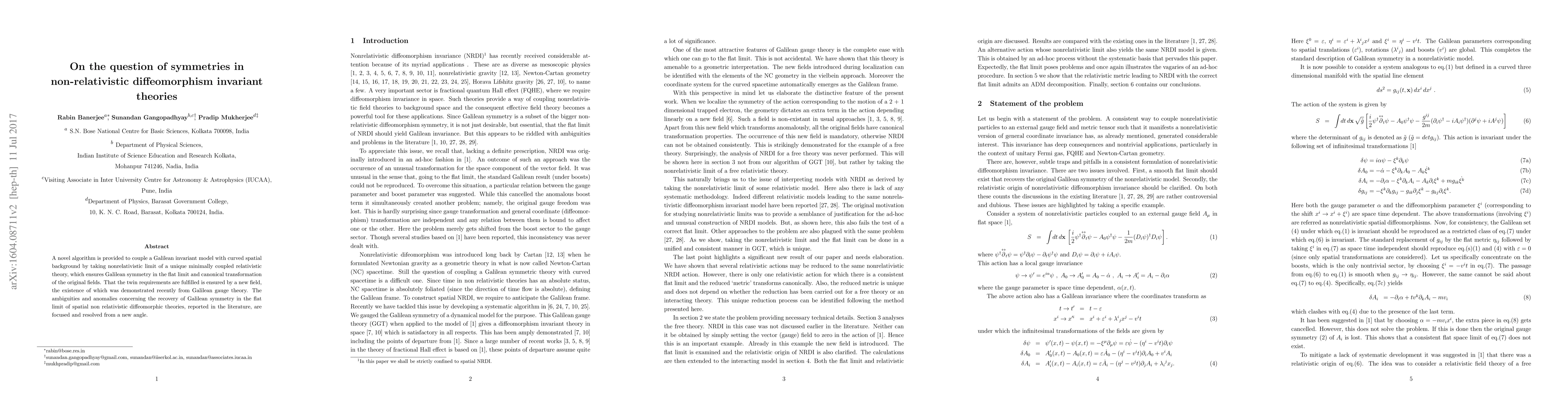 A novel algorithm is provided to couple a Galilean invariant model with curved spatial background by taking nonrelativistic limit of a unique minimally coupled relativistic theory, which ensures Galilean symmetry in the flat limit and canonical transformation of the original fields. That the twin requirements are fulfilled is ensured by a new field, the existence of which was demonstrated recently from Galilean gauge theory. The ambiguities and anomalies concerning the recovery of Galilean symmetry in the flat limit of spatial non relativistic diffeomorphic theories, reported in the literature, are focused and resolved from a new angle.