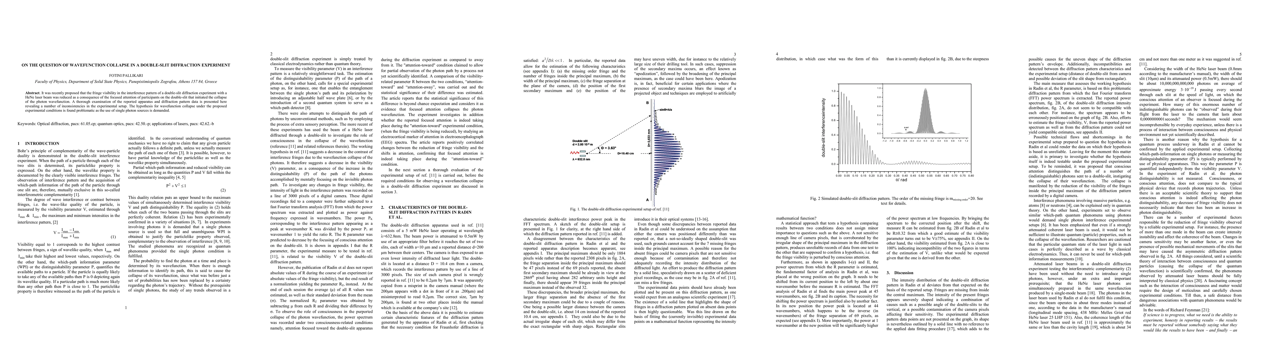 It was recently proposed that the fringe visibility in the interference pattern of a double-slit diffraction experiment with a HeNe laser beam was reduced as a consequence of the focused attention of participants on the double-slit that initiated the collapse of the photon wavefunction. A thorough examination of the reported apparatus and diffraction pattern data is presented here revealing a number of inconsistencies in the experimental setup. The hypothesis for wavefunction collapse under the proposed experimental conditions is found problematic as the use of single photon sources is demanded.