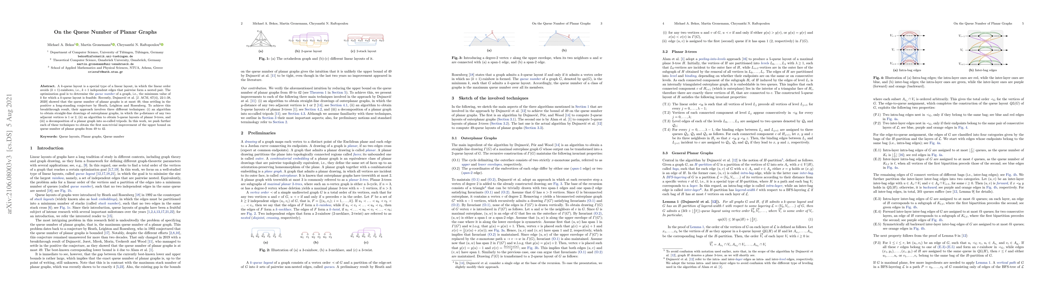 This research improves the upper bound on the queue number of planar graphs from 49 to 42 by refining three key techniques: enhancing algorithms for outerplanar graphs, developing methods for 5-queue layouts of planar 3-trees, and decomposing planar graphs into tripods. This advancement builds on previous work by Dujmovic et al. [J. ACM, 2020].