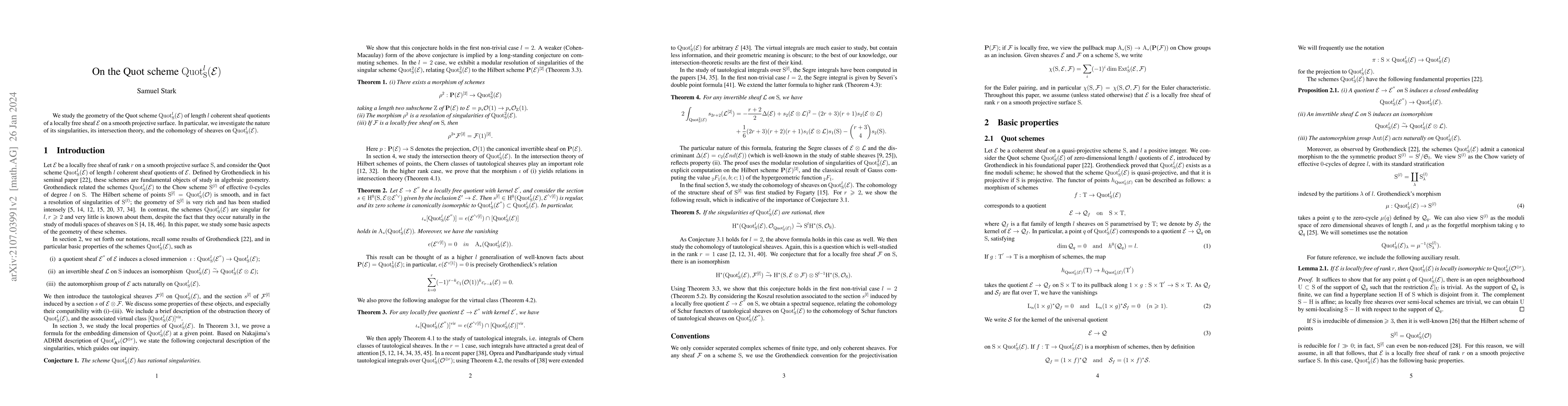 This paper examines the geometry of the Quot scheme $\mathrm{Quot}^l_{S}(\mathcal{E})$, focusing on the singularities, intersection theory, and cohomology of sheaves associated with length $l$ coherent sheaf quotients of a locally free sheaf $\mathcal{E}$ on a smooth projective surface.