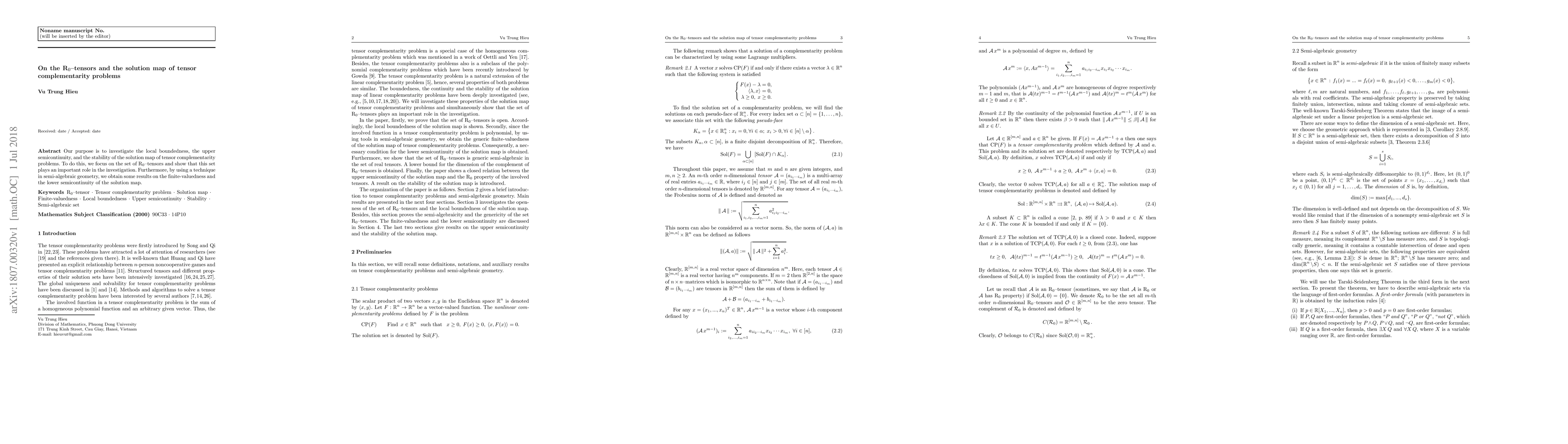 Our purpose is to investigate the local boundedness, the upper semicontinuity, and the stability of the solution map of tensor complementarity problems. To do this, we focus on the set of R$_0$--tensors and show that this set plays an important role in the investigation. Furthermore, by using a technique in semi-algebraic geometry, we obtain some results on the finite-valuedness and the lower semicontinuity of the solution map.