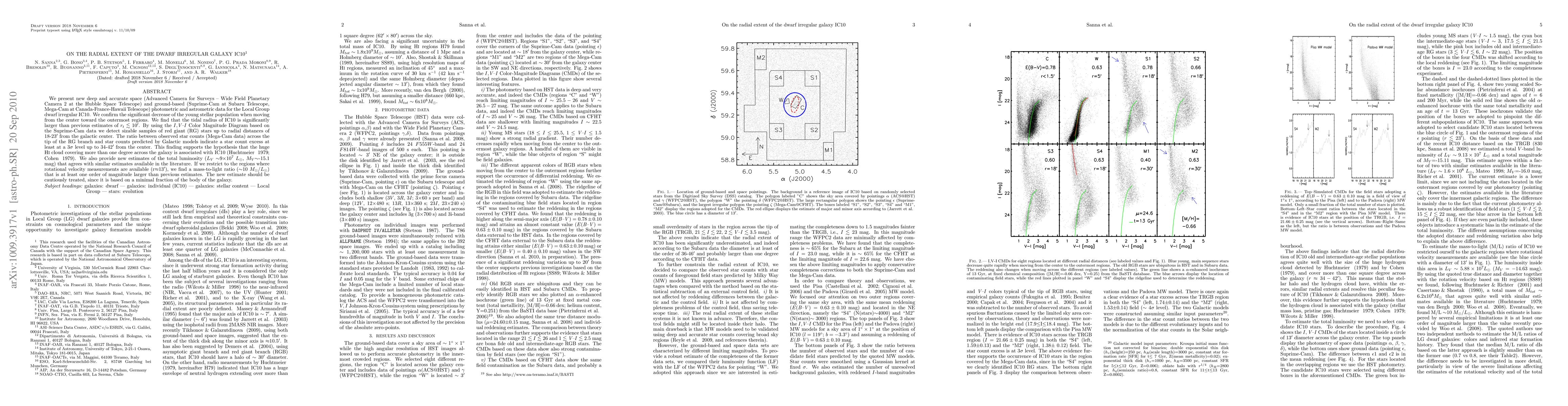 We present new deep and accurate space (Advanced Camera for Surveys -- Wide Field Planetary Camera 2 at the Hubble Space Telescope) and ground-based (Suprime-Cam at Subaru Telescope, Mega-Cam at Canada-France-Hawaii Telescope) photometric and astrometric data for the Local Group dwarf irregular IC10. We confirm the significant decrease of the young stellar population when moving from the center toward the outermost regions. We find that the tidal radius of IC10 is significantly larger than previous estimates of $r_t \lesssim$ 10\min. By using the $I$,\vmi\ Color Magnitude Diagram based on the Suprime-Cam data we detect sizable samples of red giant (RG) stars up to radial distances of 18-23$'$ from the galactic center. The ratio between observed star counts (Mega-Cam data) across the tip of the RG branch and star counts predicted by Galactic models indicate a star count excess at least at a 3$\sigma$ level up to 34-42\min\ from the center. This finding supports the hypothesis that the huge H{\size{I}} cloud covering more than one degree across the galaxy is associated with IC10 \citep{huchtmeier79,cohen79}. We also provide new estimates of the total luminosity ($L_V\sim9\times$$10^7$ $L_\odot$, $M_V$$\sim$-15.1 mag) that agrees with similar estimates available in the literature. If we restrict to the regions where rotational velocity measurements are available (r$\approx13'$), we find a mass-to-light ratio ($\sim$10 $M_\odot$ $L_\odot$) that is at least one order of magnitude larger than previous estimates. The new estimate should be cautiously treated, since it is based on a minimal fraction of the body of the galaxy.
