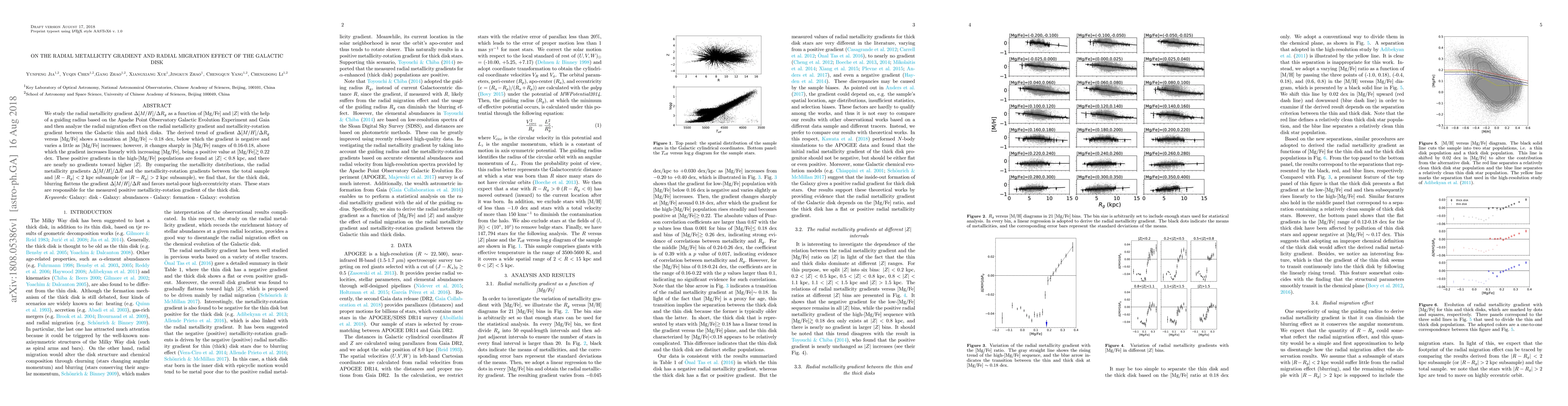 This paper investigates the radial metallicity gradient in the Galactic disk, revealing a transition in gradient behavior at [Mg/Fe] $\sim 0.18$ dex. The study also finds that radial migration affects the gradient, flattening it in the thick disk and favoring metal-poor, high-eccentricity stars, which contribute to the positive metallicity-rotation gradient.
