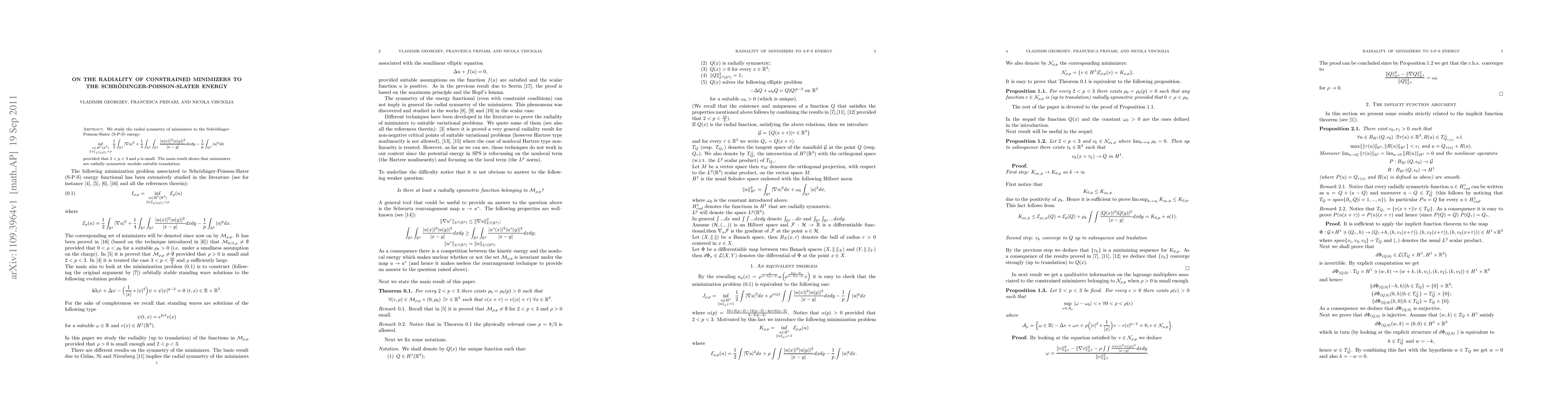 We study the radial symmetry of minimizers to the Schroedinger-Poisson-Slater (S-P-S) energy.