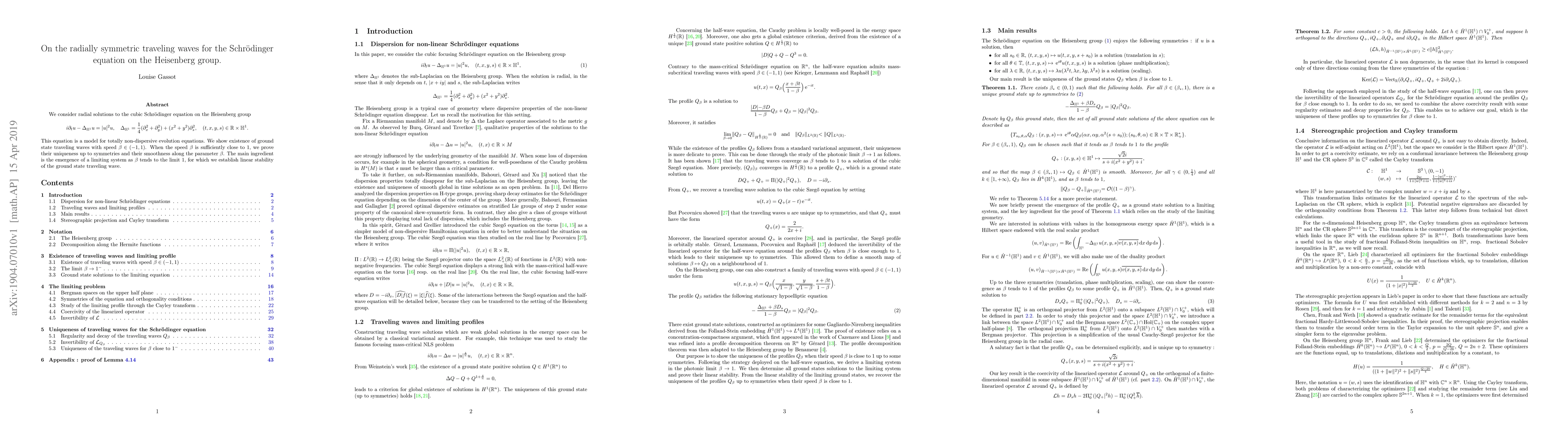 The paper proves the existence of radially symmetric traveling waves for the cubic Schrödinger equation on the Heisenberg group, which models non-dispersive evolution. For speeds close to 1, it ensures uniqueness and smoothness of these waves, relying on a limiting system's linear stability as the speed approaches 1.