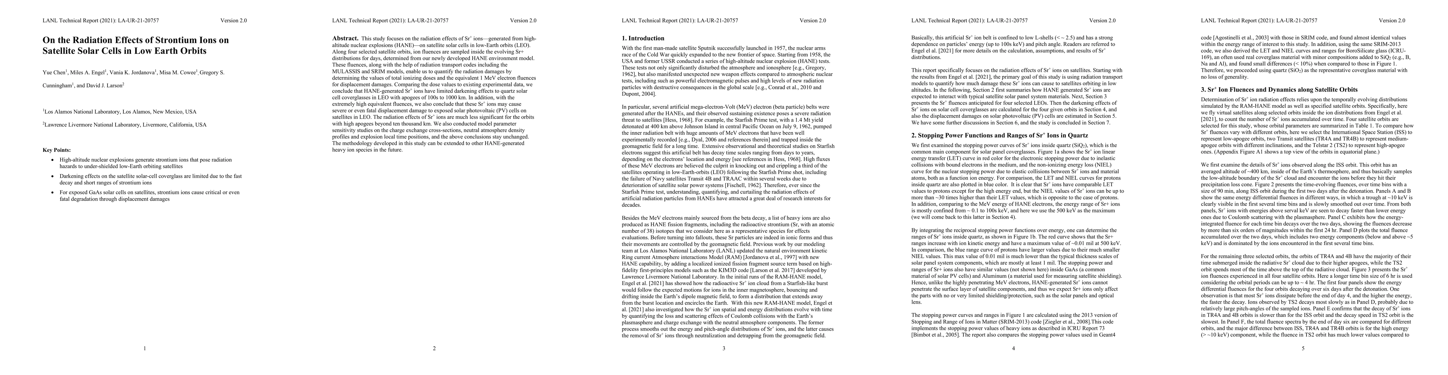 This study investigates the effects of Strontium ions from high-altitude nuclear explosions on satellite solar cells in low Earth orbits, finding limited damage to quartz coverglasses but severe damage to photovoltaic cells at lower altitudes.