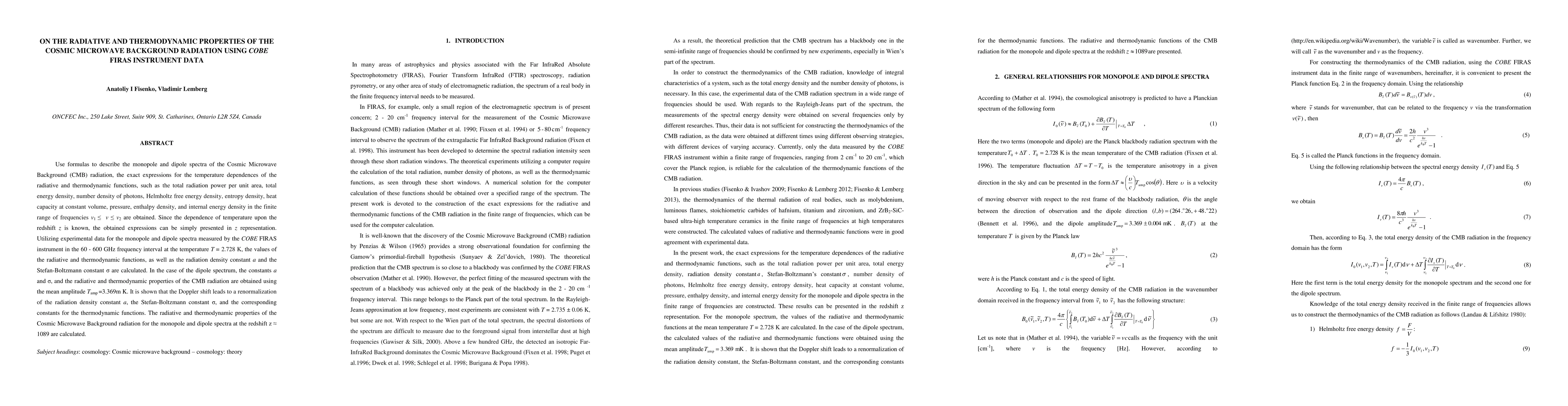 This paper derives expressions for the radiative and thermodynamic properties of the Cosmic Microwave Background (CMB) radiation using COBE FIRAS data, calculating values for functions like energy density and entropy density. It shows that the Doppler shift causes renormalization of these properties and provides calculations for the monopole and dipole spectra at the redshift z = 1089.