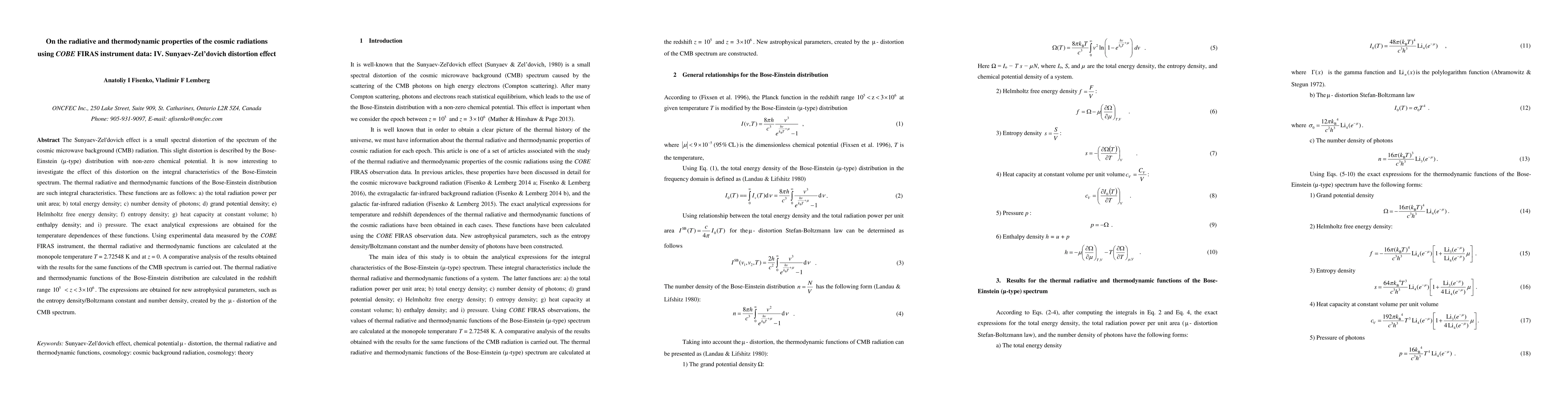 This paper investigates the Sunyaev-Zeldovich effect's impact on the cosmic microwave background (CMB) using COBE FIRAS data, deriving analytical expressions for thermal radiative and thermodynamic functions of the Bose-Einstein distribution. Comparative analysis reveals new astrophysical parameters influenced by the spectral distortion.