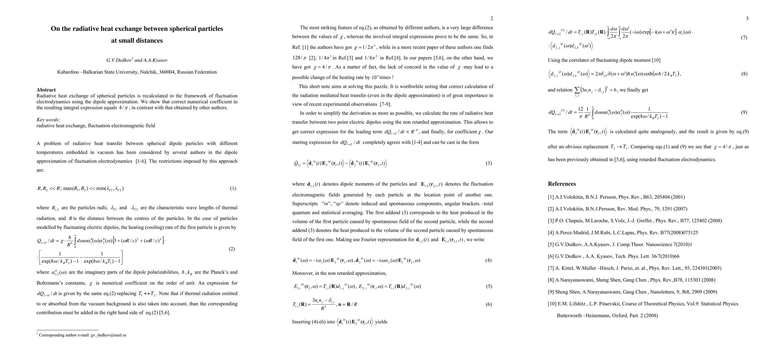 Summary: This paper recalculates radiative heat exchange between spherical particles at small distances using fluctuation electrodynamics and dipole approximation, revealing that the correct numerical coefficient in the integral expression is 4/π, differing from previous results.