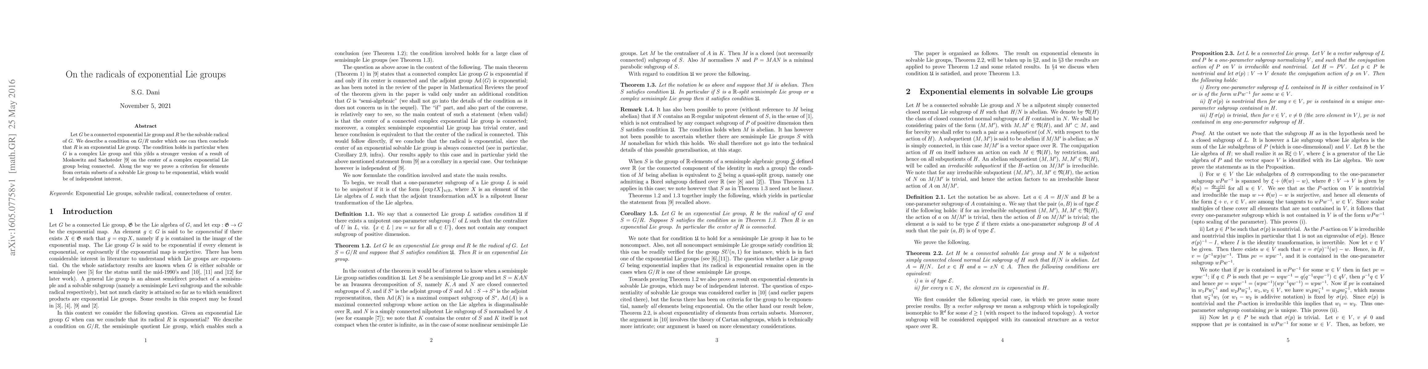 Let $G$ be a connected exponential Lie group and $R$ be the solvable radical of $G$. We describe a condition on $G/R$ under which one can then conclude that $R$ is an exponential Lie group. The condition holds in particular when $G$ is a complex Lie group and this yields a stronger version of a result of Moskowitz and Sacksteder \cite{MS} on the center of a complex exponential Lie group being connected. Along the way we prove a criterion for elements from certain subsets of a solvable Lie group to be exponential, which would be of independent interest.