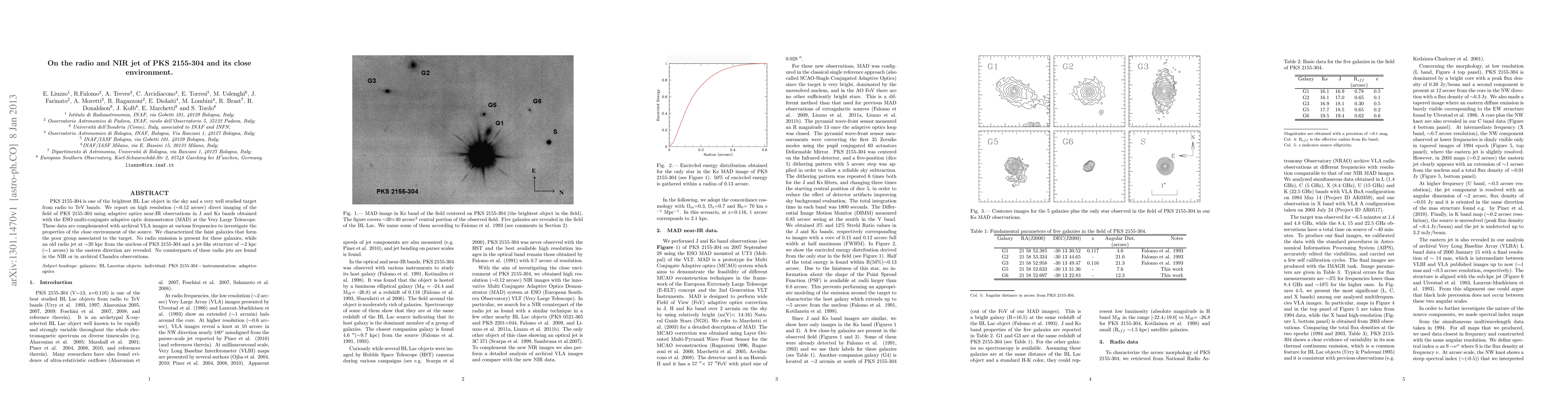 PKS 2155-304 is one of the brightest BL Lac object in the sky and a very well studied target from radio to TeV bands. We report on high-resolution (~ 0.12 arcsec) direct imaging of the field of PKS 2155-304 using adaptive optics near-IR observations in J and Ks bands obtained with the ESO multi-conjugate adaptive optic demonstrator (MAD) at the Very Large Telescope. These data are complemented with archival VLA images at various frequencies to investigate the properties of the close environment of the source. We characterized the faint galaxies that form the poor group associated to the target. No radio emission is present for these galaxies, while an old radio jet at ~ 20 kpc from the nucleus of PKS 2155-304 and a jet-like structure of ~ 2 kpc (~ 1 arcsec) in the eastern direction are revealed. No counterparts of these radio jets are found in the NIR or in archival Chandra observations.