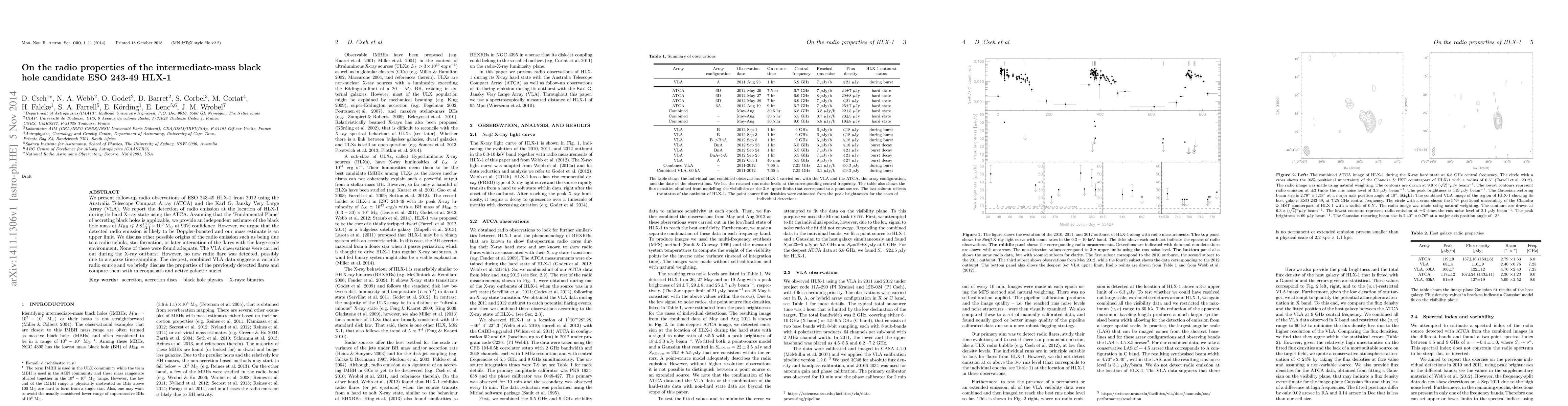 We present follow-up radio observations of ESO 243-49 HLX-1 from 2012 using the Australia Telescope Compact Array (ATCA) and the Karl G. Jansky Very Large Array (VLA). We report the detection of radio emission at the location of HLX-1 during its hard X-ray state using the ATCA. Assuming that the `Fundamental Plane' of accreting black holes is applicable, we provide an independent estimate of the black hole mass of $M_{\rm{BH}}\leq2.8^{+7.5}_{-2.1} \times 10^{6}$ M$_{\odot}$ at 90% confidence. However, we argue that the detected radio emission is likely to be Doppler-boosted and our mass estimate is an upper limit. We discuss other possible origins of the radio emission such as being due to a radio nebula, star formation, or later interaction of the flares with the large-scale environment. None of these were found adequate. The VLA observations were carried out during the X-ray outburst. However, no new radio flare was detected, possibly due to a sparse time sampling. The deepest, combined VLA data suggests a variable radio source and we briefly discuss the properties of the previously detected flares and compare them with microquasars and active galactic nuclei.