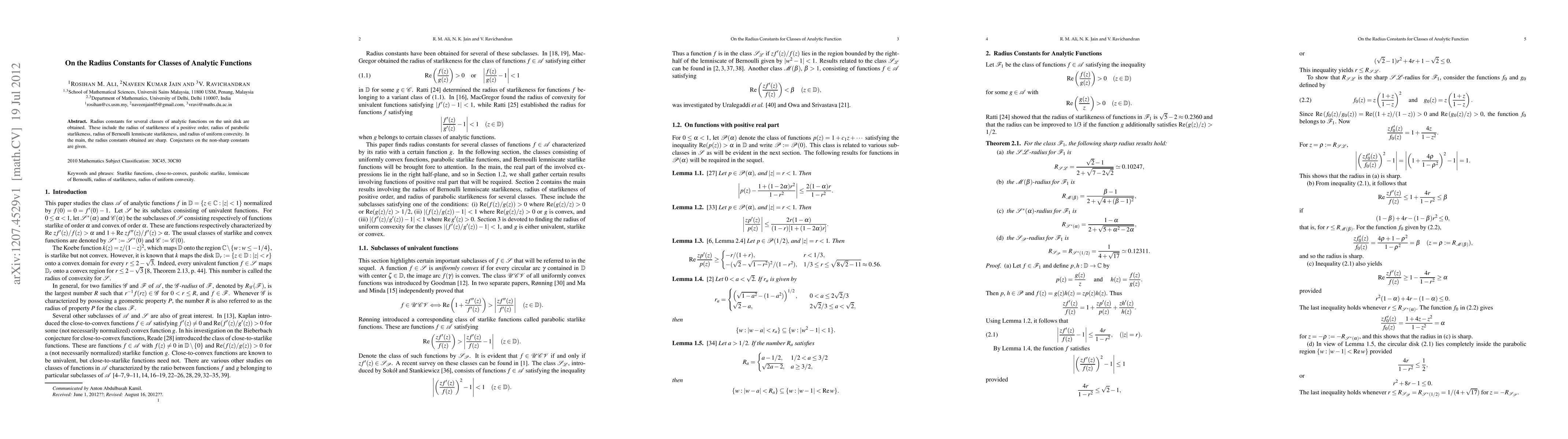 The paper determines sharp radius constants for various classes of analytic functions in the unit disk, including starlikeness, parabolic starlikeness, Bernoulli lemniscate starlikeness, and uniform convexity, and proposes conjectures for non-sharp constants.