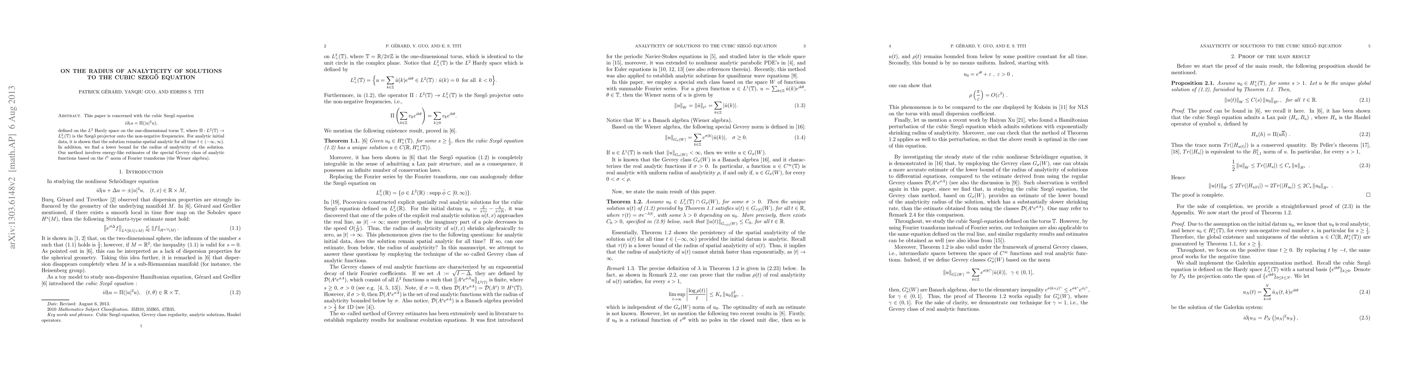 This paper is concerned with the cubic Szeg\H{o} equation $$ i\partial_t u=\Pi(|u|^2 u), $$ defined on the $L^2$ Hardy space on the one-dimensional torus $\mathbb T$, where $\Pi: L^2(\mathbb T)\rightarrow L^2_+(\mathbb T)$ is the Szeg\H{o} projector onto the non-negative frequencies. For analytic initial data, it is shown that the solution remains spatial analytic for all time $t\in (-\infty,\infty)$. In addition, we find a lower bound for the radius of analyticity of the solution. Our method involves energy-like estimates of the special Gevrey class of analytic functions based on the $\ell^1$ norm of Fourier transforms (the Wiener algebra).