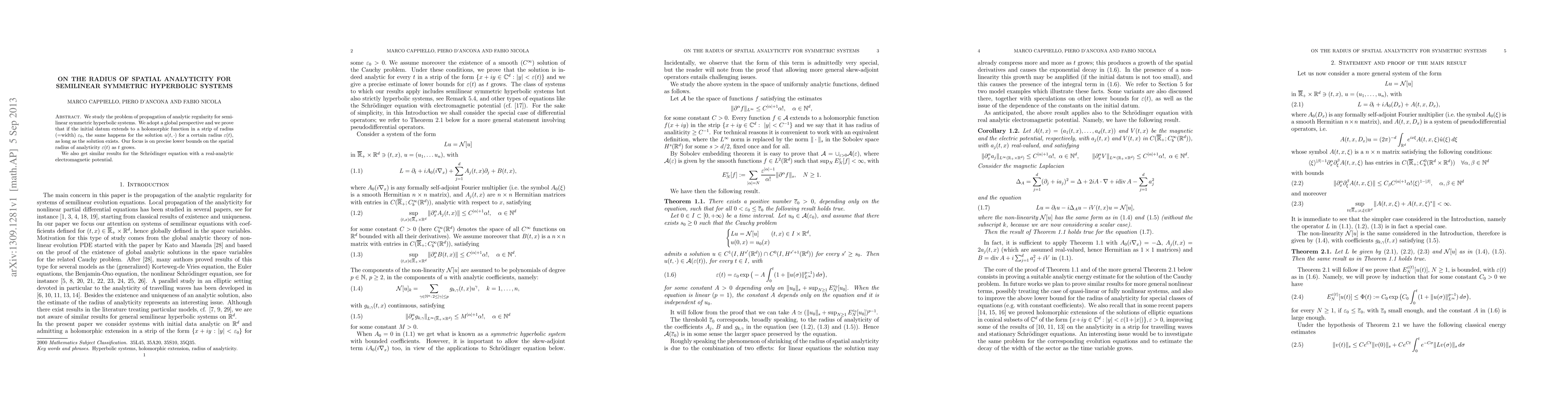 This paper investigates the propagation of analytic regularity in semilinear symmetric hyperbolic systems, proving that if the initial data is holomorphic within a strip of radius ε₀, the solution retains this property within a growing radius ε(t). The study also extends these results to the Schrödinger equation with real-analytic electromagnetic potentials.