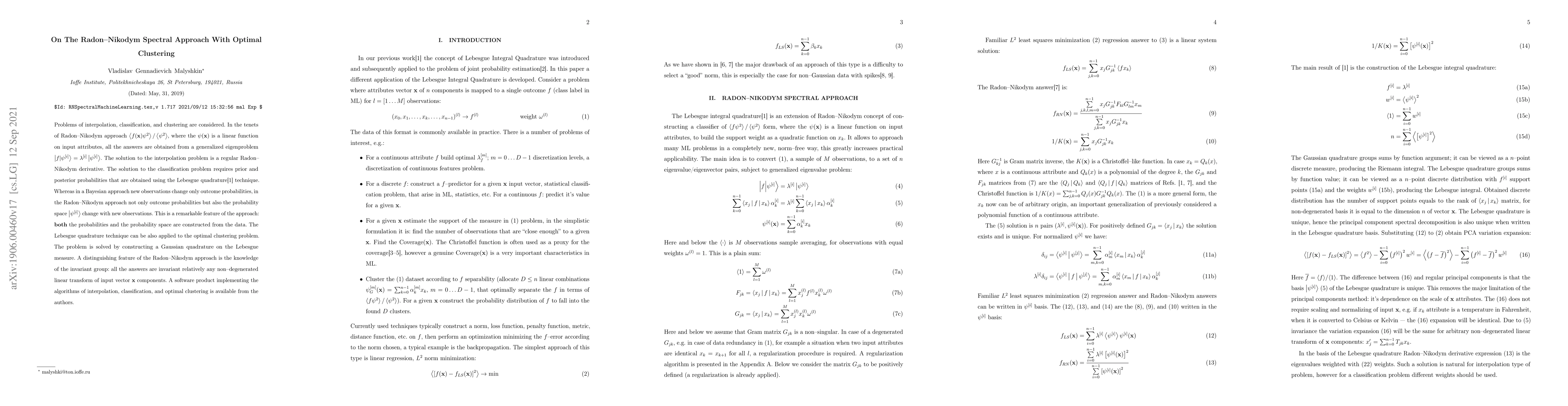 Problems of interpolation, classification, and clustering are considered. In the tenets of Radon--Nikodym approach $\langle f(\mathbf{x})\psi^2 \rangle / \langle\psi^2\rangle$, where the $\psi(\mathbf{x})$ is a linear function on input attributes, all the answers are obtained from a generalized eigenproblem $|f|\psi^{[i]}\rangle = \lambda^{[i]} |\psi^{[i]}\rangle$. The solution to the interpolation problem is a regular Radon-Nikodym derivative. The solution to the classification problem requires prior and posterior probabilities that are obtained using the Lebesgue quadrature[1] technique. Whereas in a Bayesian approach new observations change only outcome probabilities, in the Radon-Nikodym approach not only outcome probabilities but also the probability space $|\psi^{[i]}\rangle$ change with new observations. This is a remarkable feature of the approach: both the probabilities and the probability space are constructed from the data. The Lebesgue quadrature technique can be also applied to the optimal clustering problem. The problem is solved by constructing a Gaussian quadrature on the Lebesgue measure. A distinguishing feature of the Radon-Nikodym approach is the knowledge of the invariant group: all the answers are invariant relatively any non-degenerated linear transform of input vector $\mathbf{x}$ components. A software product implementing the algorithms of interpolation, classification, and optimal clustering is available from the authors.